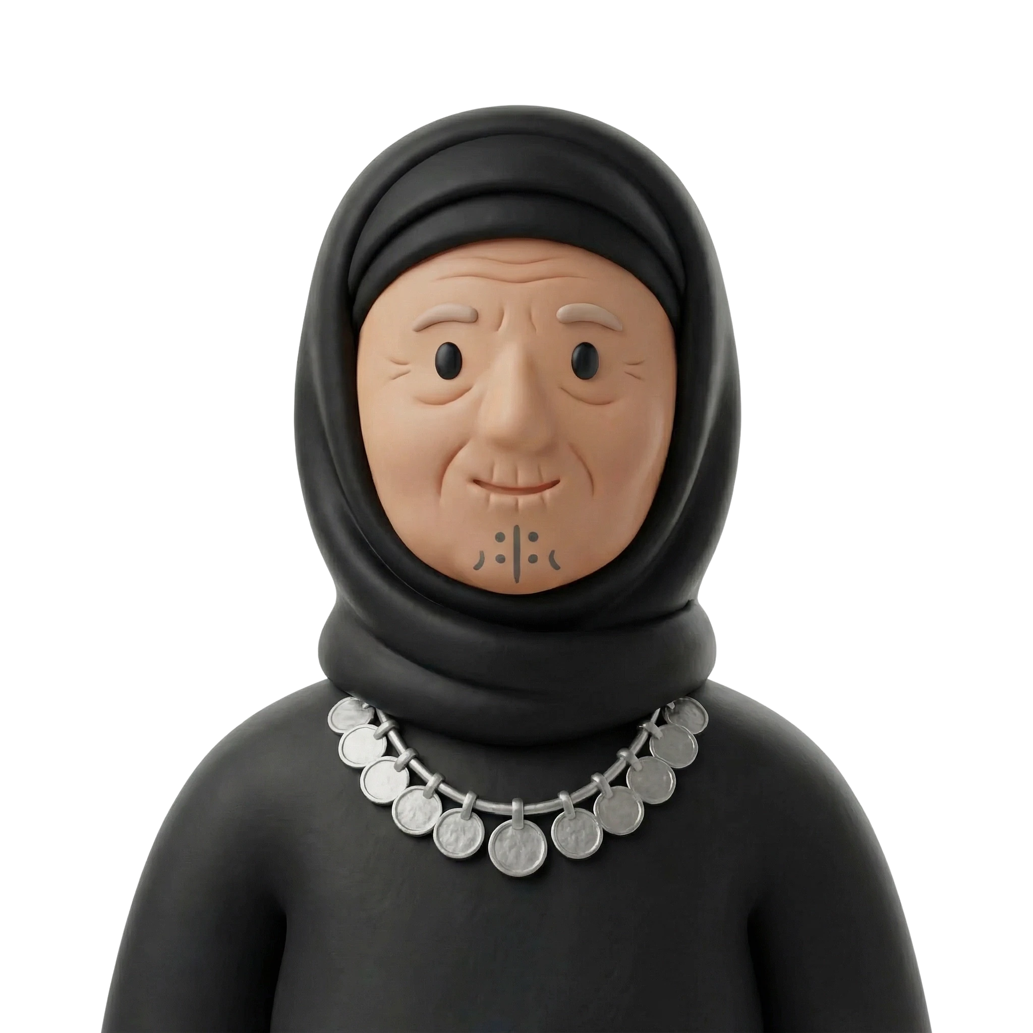 A wise Bedouin grandmother adorned in traditional Levantine attire, featuring facial tattoos and a silver coin necklace—symbolizing heritage, wisdom, and storytelling passed through generations.