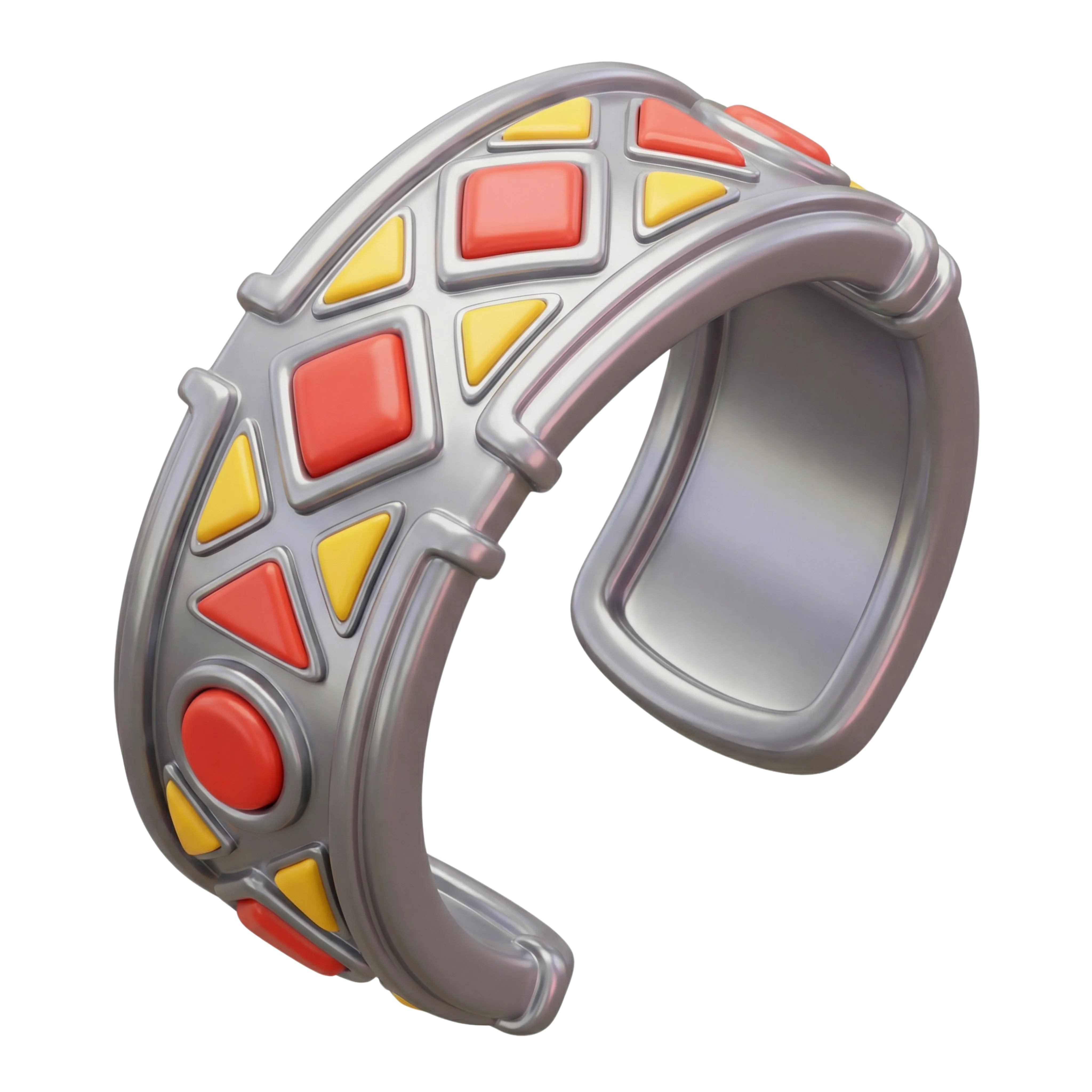 A high-resolution 3D model of a traditional Berber bracelet crafted in matte silver, featuring vibrant red and yellow enamel geometric patterns. This asset is ideal for showcasing North African heritage in digital art, product design, or cultural applications.