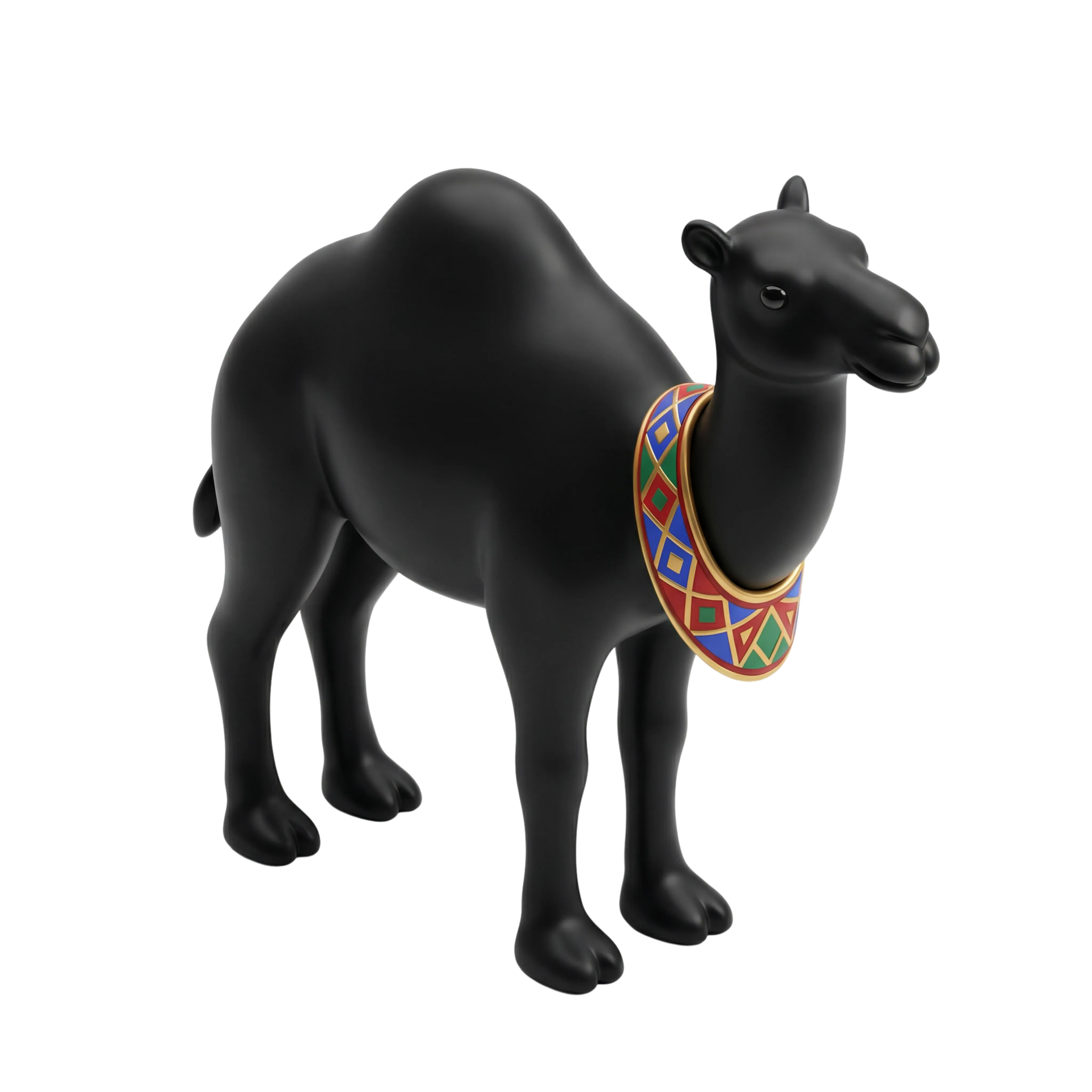 مجسم ثلاثي الأبعاد بأسلوب فني لجمل أسود بسطح غير لامع وطوق زخرفي ملون، يعكس رمزية الحياة الصحراوية والتراث في شبه الجزيرة العربية. مناسب للاستخدام في التطبيقات الثقافية، ومواد الترويج السياحي، والبيئات ذات الطابع التراثي، أو المحتوى التعليمي.