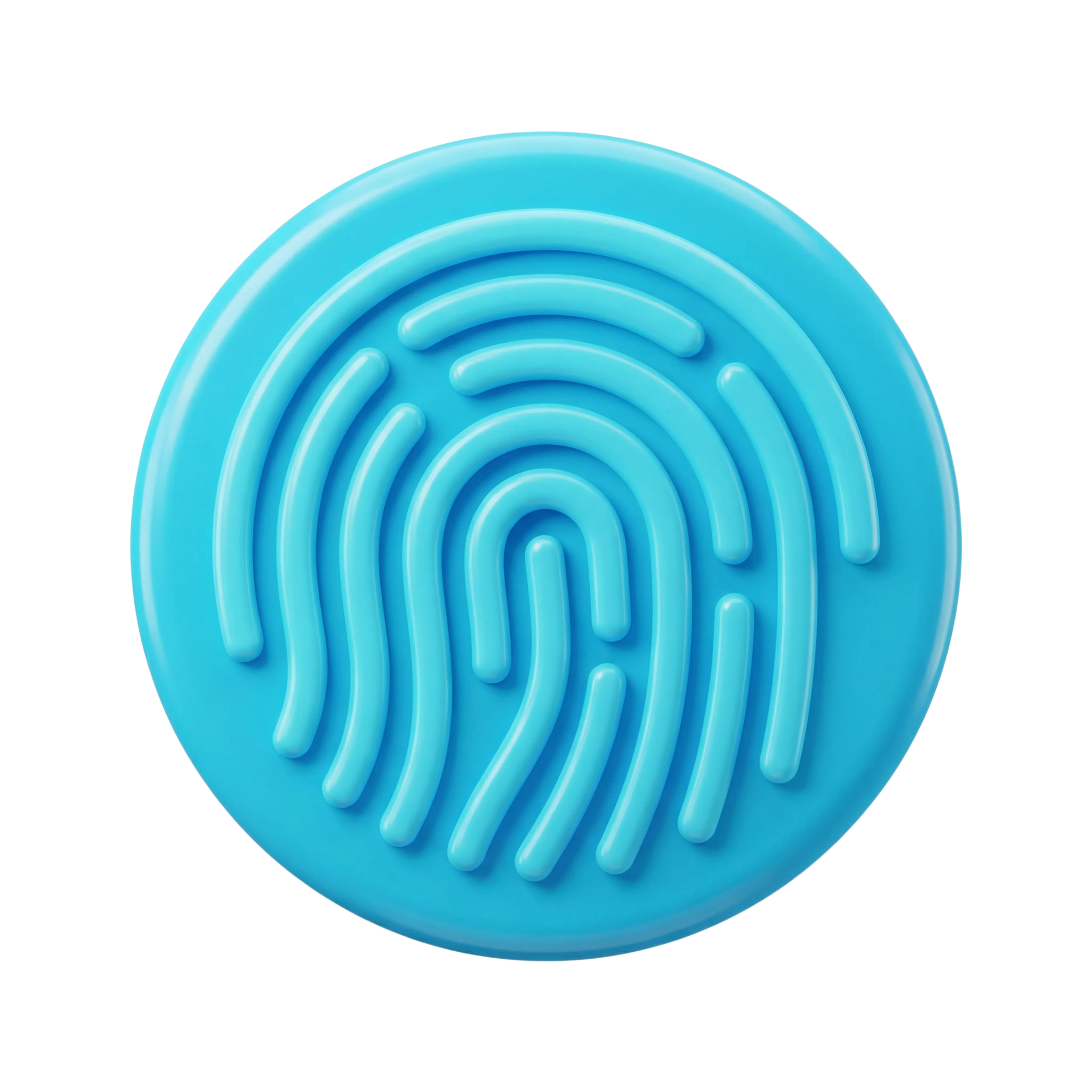 مجسم ثلاثي الأبعاد عالي الدقة لأيقونة بصمة إصبع دائرية بتأثير لامع ولون أزرق، يرمز إلى المصادقة البيومترية أو ميزات الأمان في الواجهات الرقمية. مثالي لتصميمات واجهات المستخدم، ونماذج التطبيقات، والرسومات التقنية والأمن السيبراني.