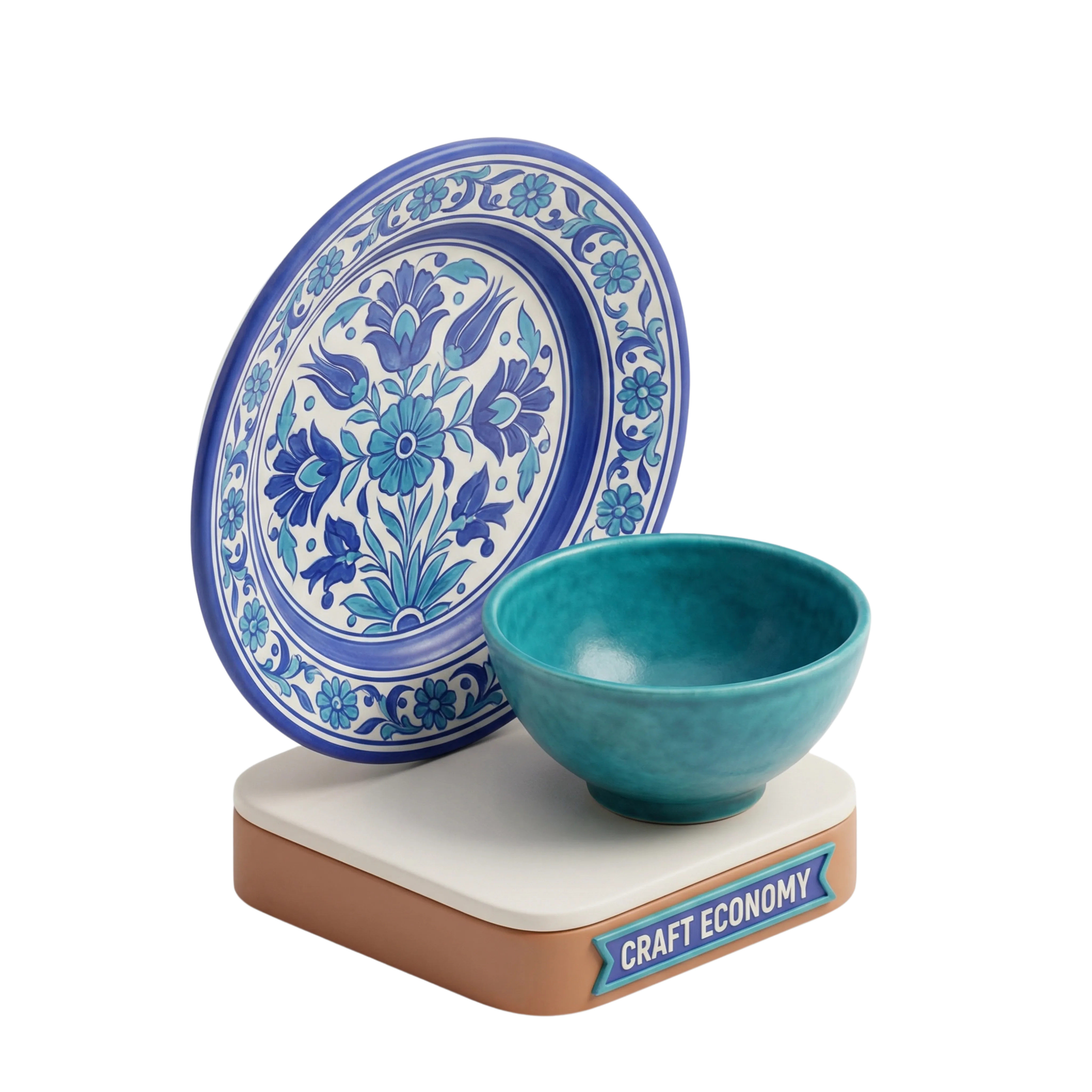 عرض ثلاثي الأبعاد دقيق لخزف تركي تقليدي باللون الأزرق، يضم وعاء بلمسة لامعة وصحن بزخارف زهرية مستوحاة من الفن العثماني. مناسب للتصاميم التراثية، المتاجر الإلكترونية، أو مشاهد الديكور الثقافي.