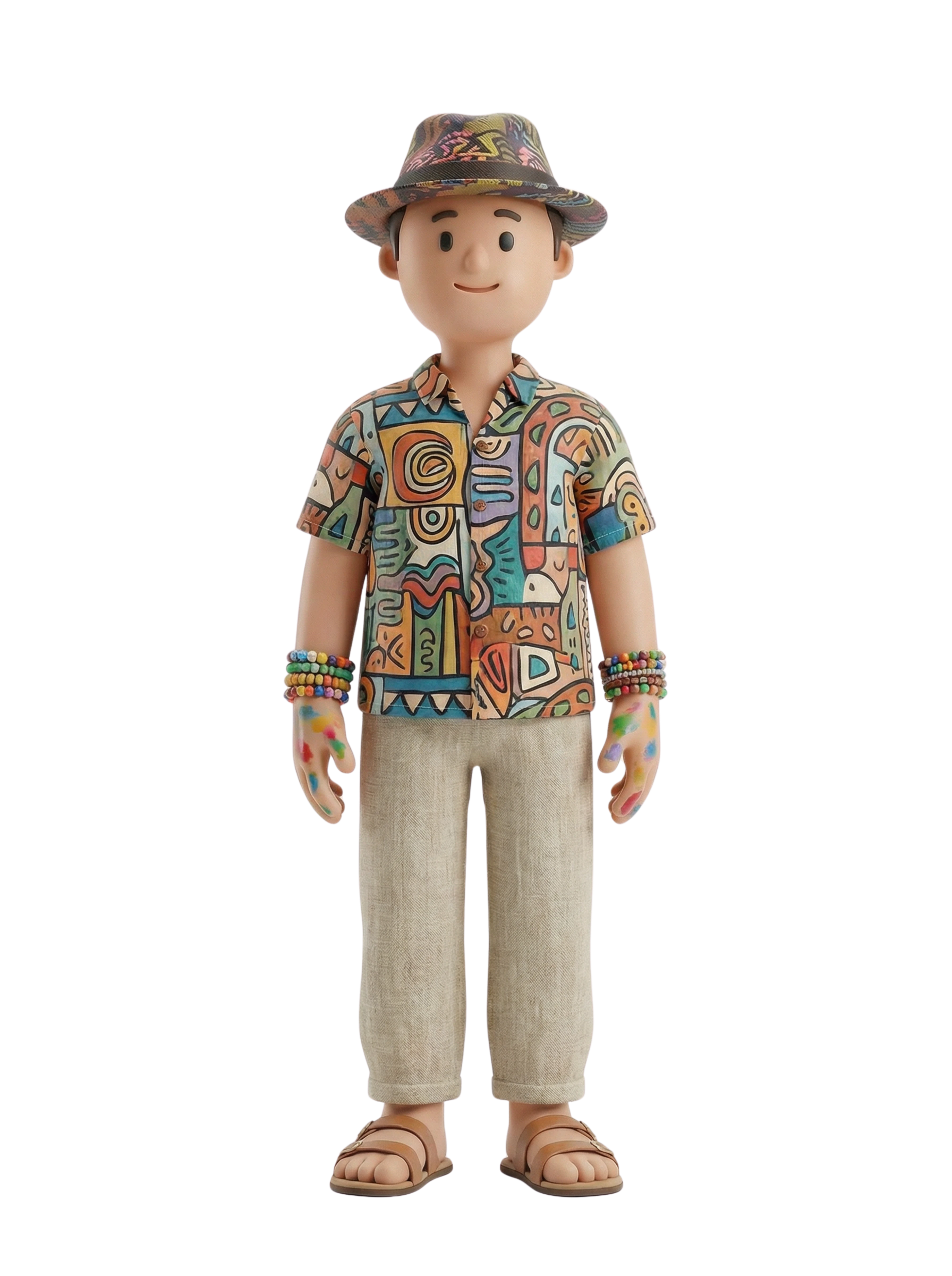 A free-spirited street artist embracing a bohemian lifestyle, dressed in Moroccan-inspired patterns and casual attire, expressing creativity through wearable art and vibrant accessories.