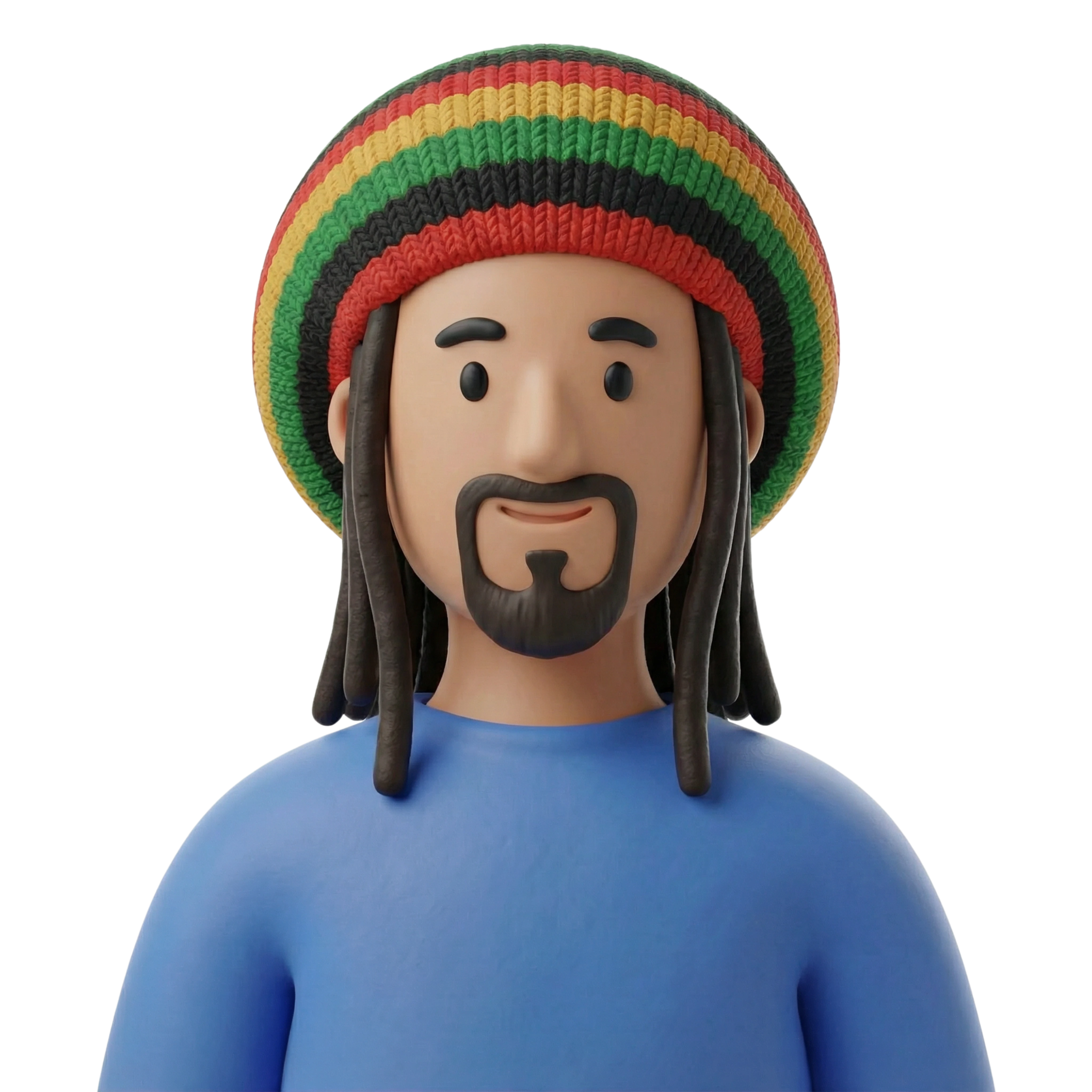 A cheerful Caribbean musician styled in iconic Rasta colors and dreadlocks, representing cultural pride and a love for reggae music.