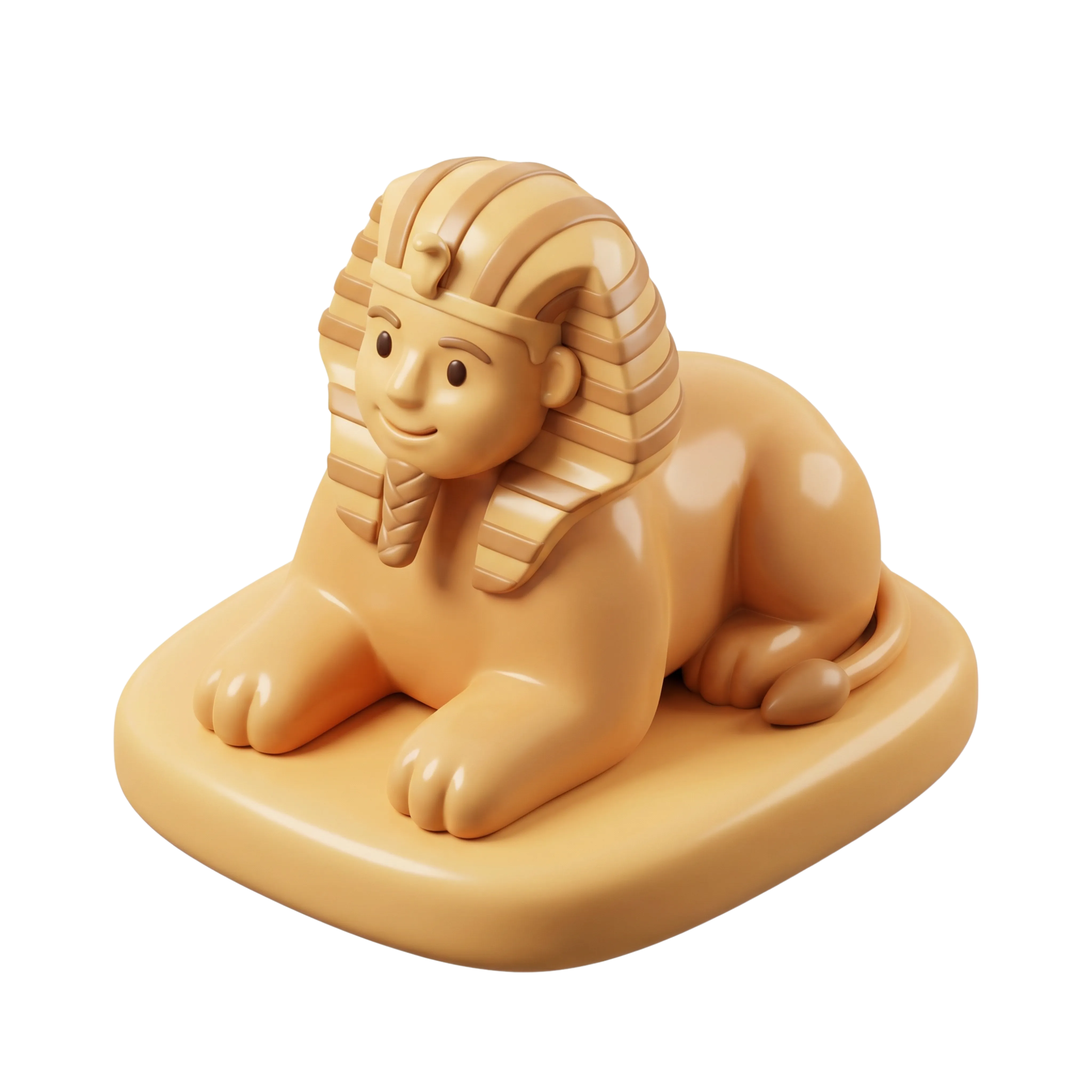 مجسم ثلاثي الأبعاد بتصميم كرتوني لتمثال أبو الهول بملمس ناعم ولمسة لامعة، مثالي لتطبيقات تعليمية، محتوى للأطفال، أو عروض مرئية ذات طابع تاريخي وثقافي مرح.
