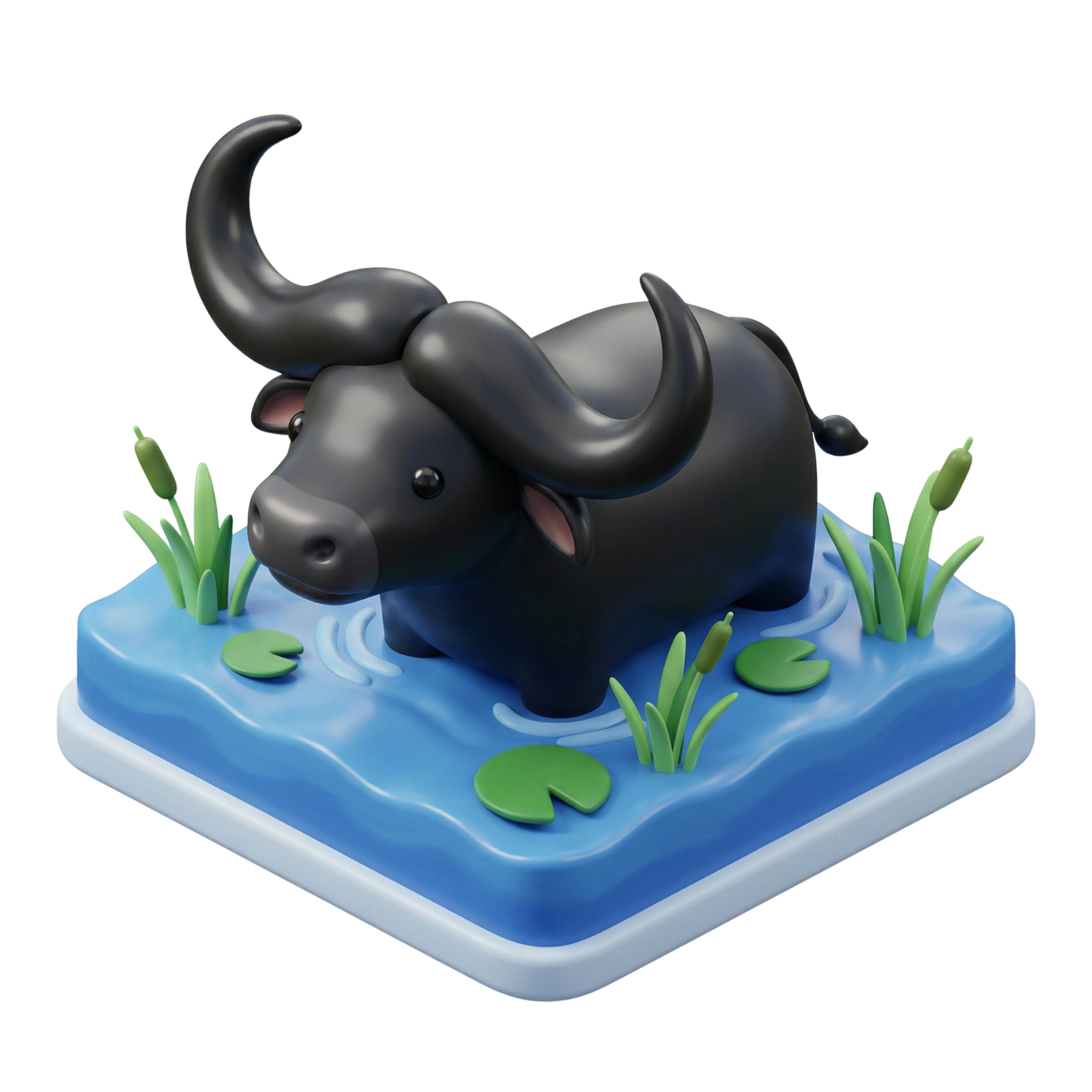 A stylized 3D render of a water buffalo with a smooth, glossy finish depicted in a cartoonish, minimal style. The buffalo stands in a blue marsh base with lily pads and grass, ideal for educational content, children's apps, agricultural infographics, or animal-themed UI elements.