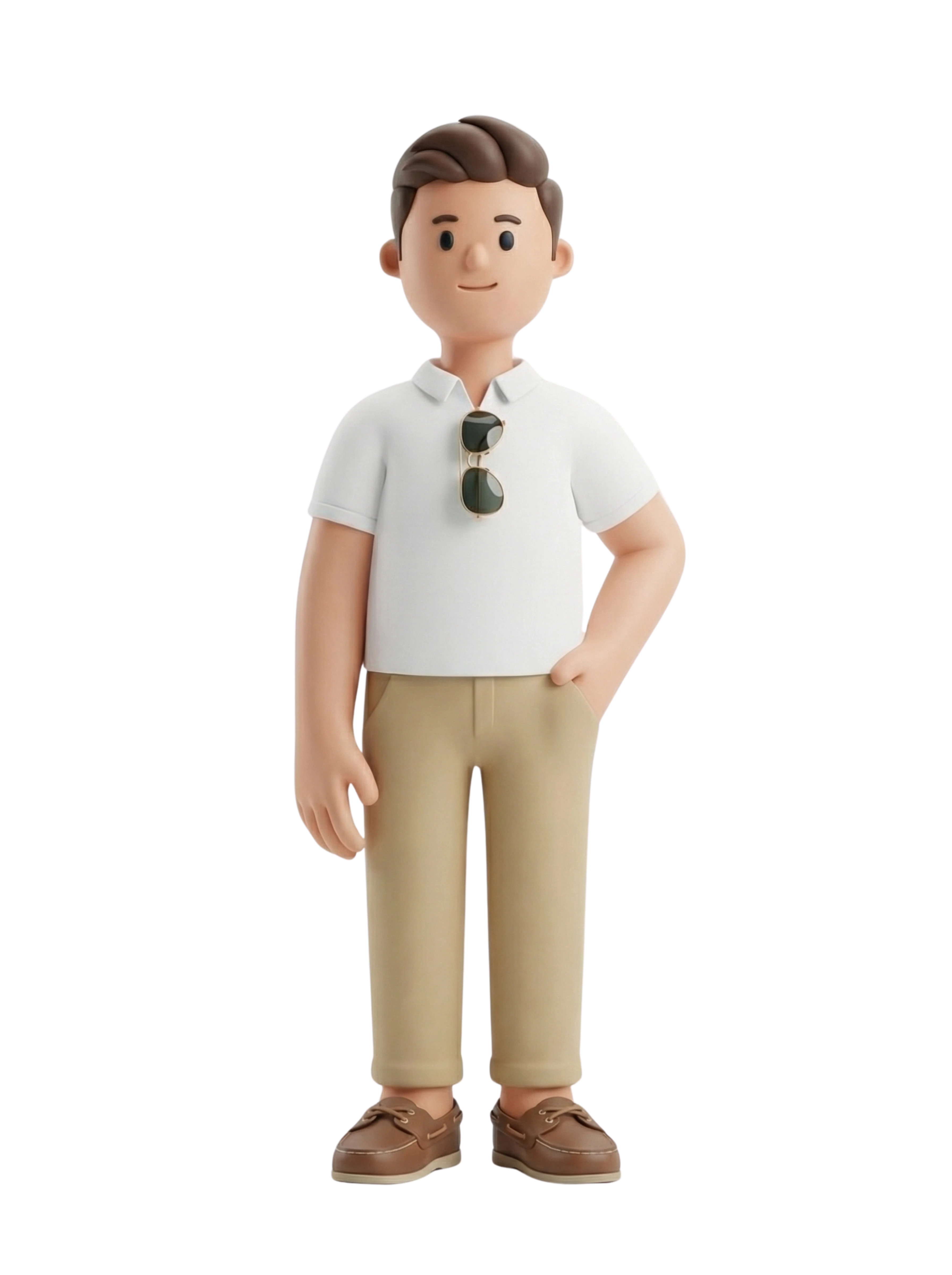 A relaxed traveler enjoying a sunny day in casual summer wear, reflecting a contemporary lifestyle filled with leisure, exploration, and modern comforts.