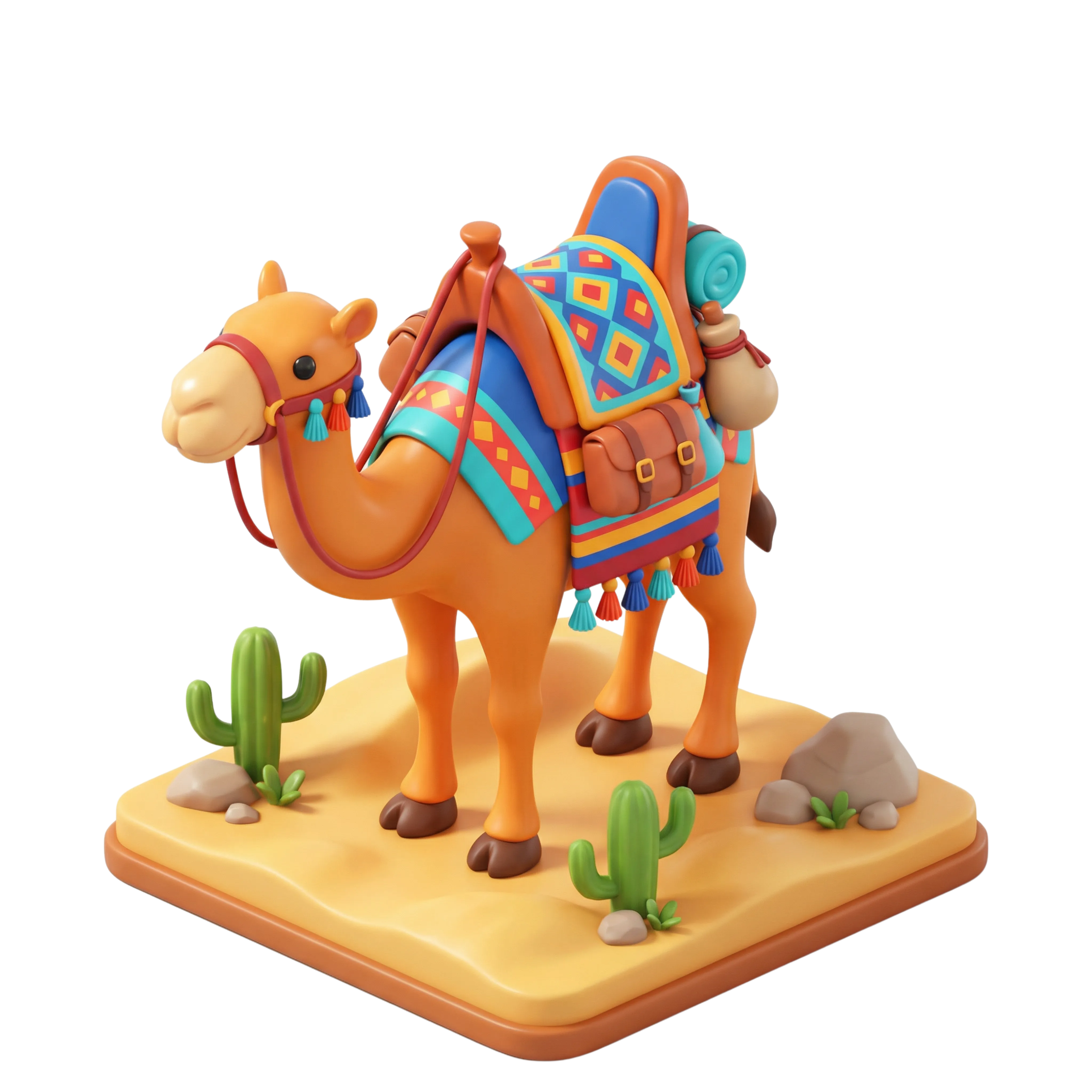 A stylized 3D render of a desert camel adorned with a vibrant saddle, tassels, and travel accessories including water jars and rolled fabric. The piece has a soft matte finish and sits on a desert base with cacti and rocks. Ideal for cultural visuals, educational apps, or themed UI elements.