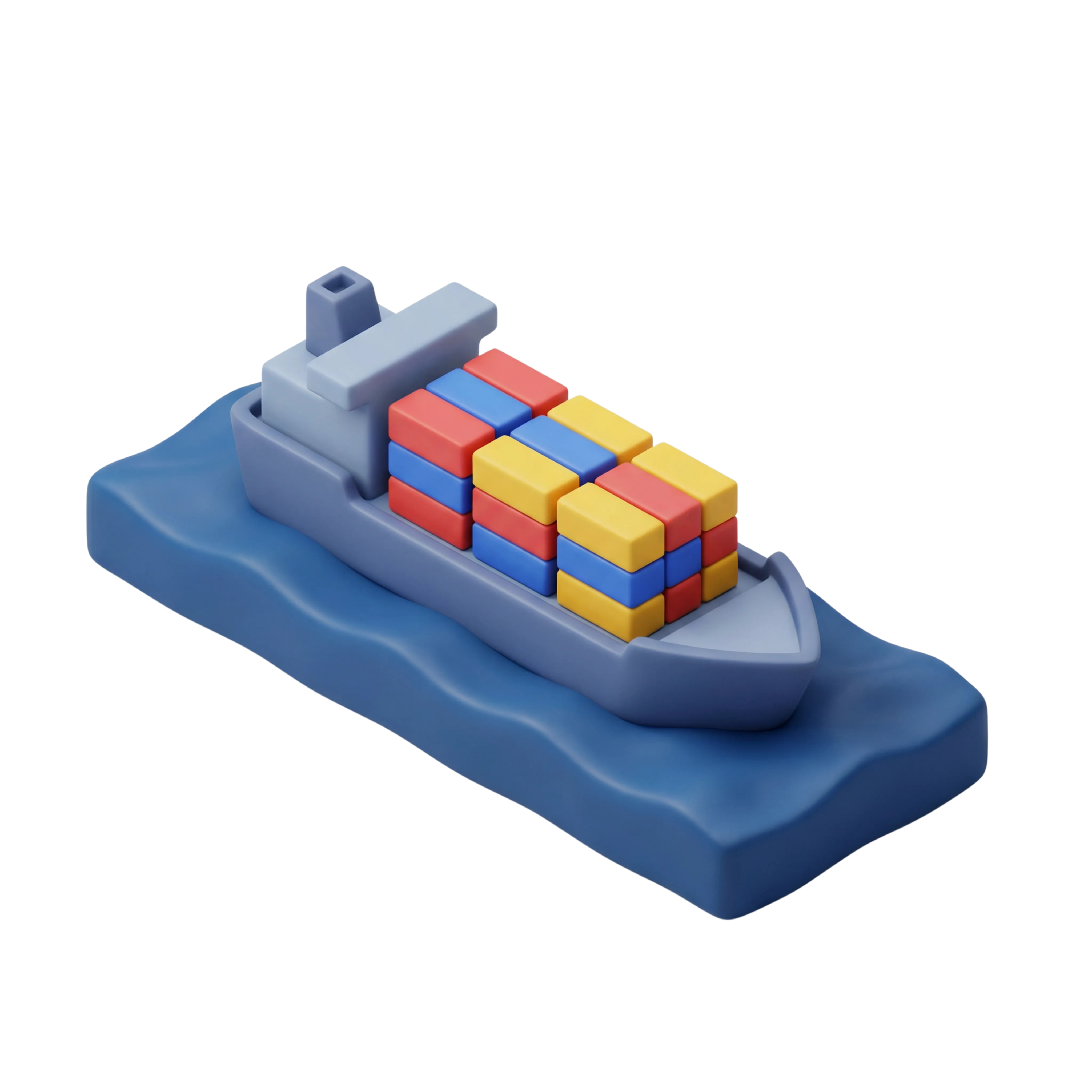 مجسم ثلاثي الأبعاد عالي الجودة لسفينة شحن تحمل حاويات ملونة، بتصميم ناعم ولمسة غير لامعة. مناسب لاستخدامات التصميم المتعلقة بالنقل، الخدمات اللوجستية، أو واجهات التطبيقات.