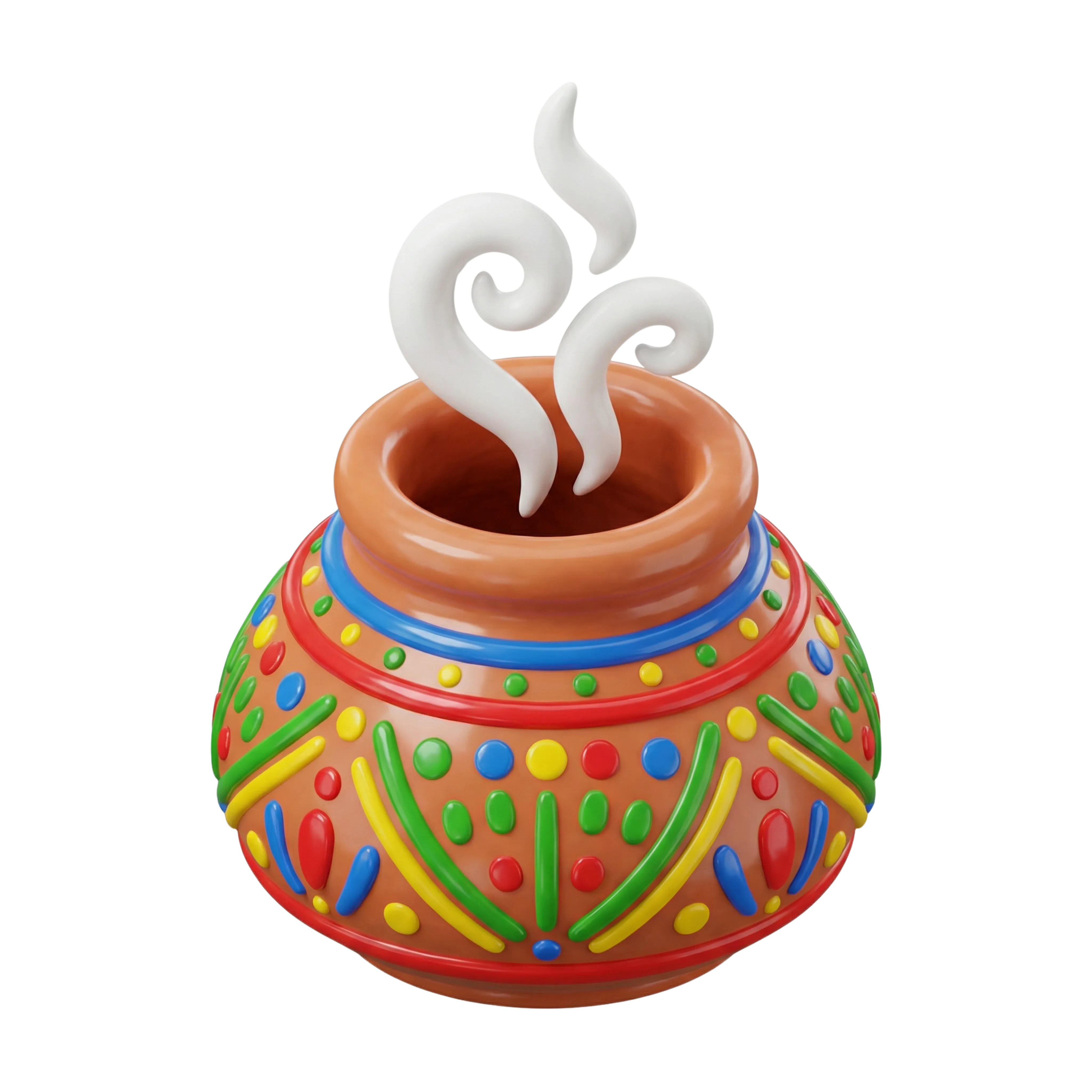 A detailed 3D model of a traditional Saudi clay incense burner, handcrafted style with glossy finish and colorful painted patterns. Designed for cultural design themes, interior renderings, or festive digital illustrations representing traditional Arabian hospitality and ambiance.