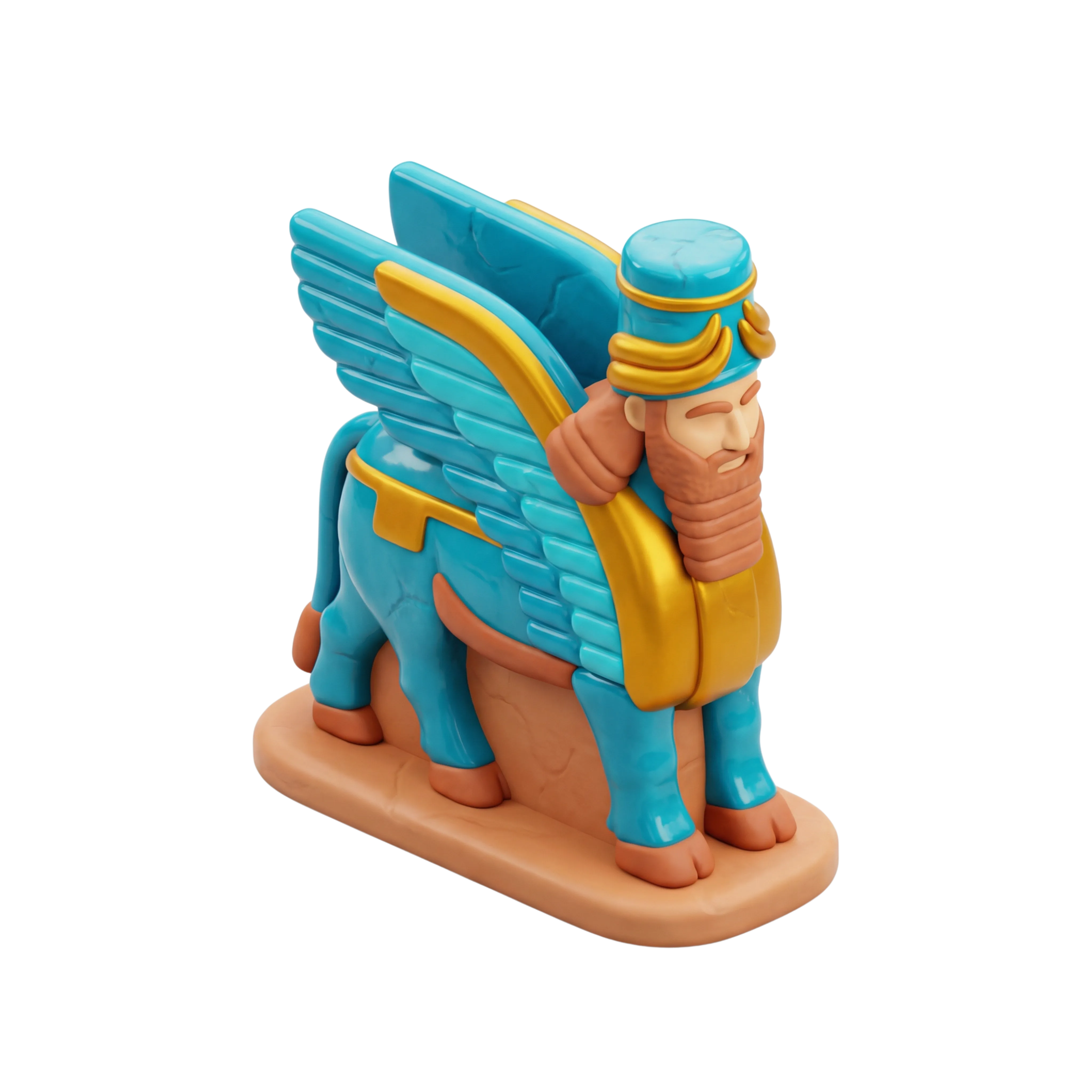 A high-resolution 3D model of a stylized Lamassu statue — a mythological Assyrian creature with a human head, wings, and lion's body. The matte finish and vibrant colors make it suitable for educational content, digital museums, historical video games, and Mesopotamian-inspired design projects.