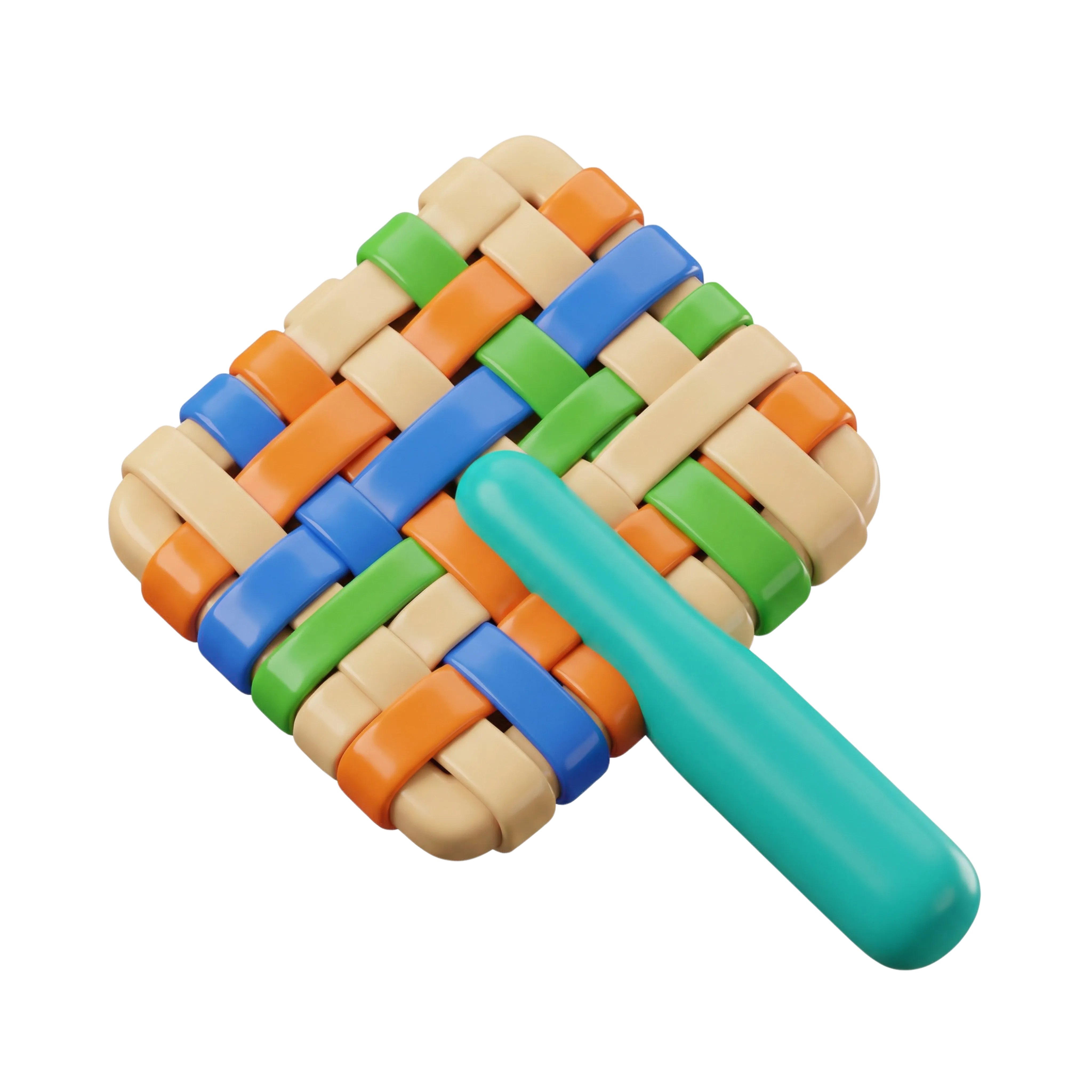 A high-quality 3D rendering of a traditional hand fan made of interwoven palm fronds in vibrant colors, featuring a smooth, glossy teal handle. The woven texture showcases the craftsmanship typical of Saudi palm weaving traditions. Perfect for cultural illustrations, heritage exhibitions, and educational visuals.