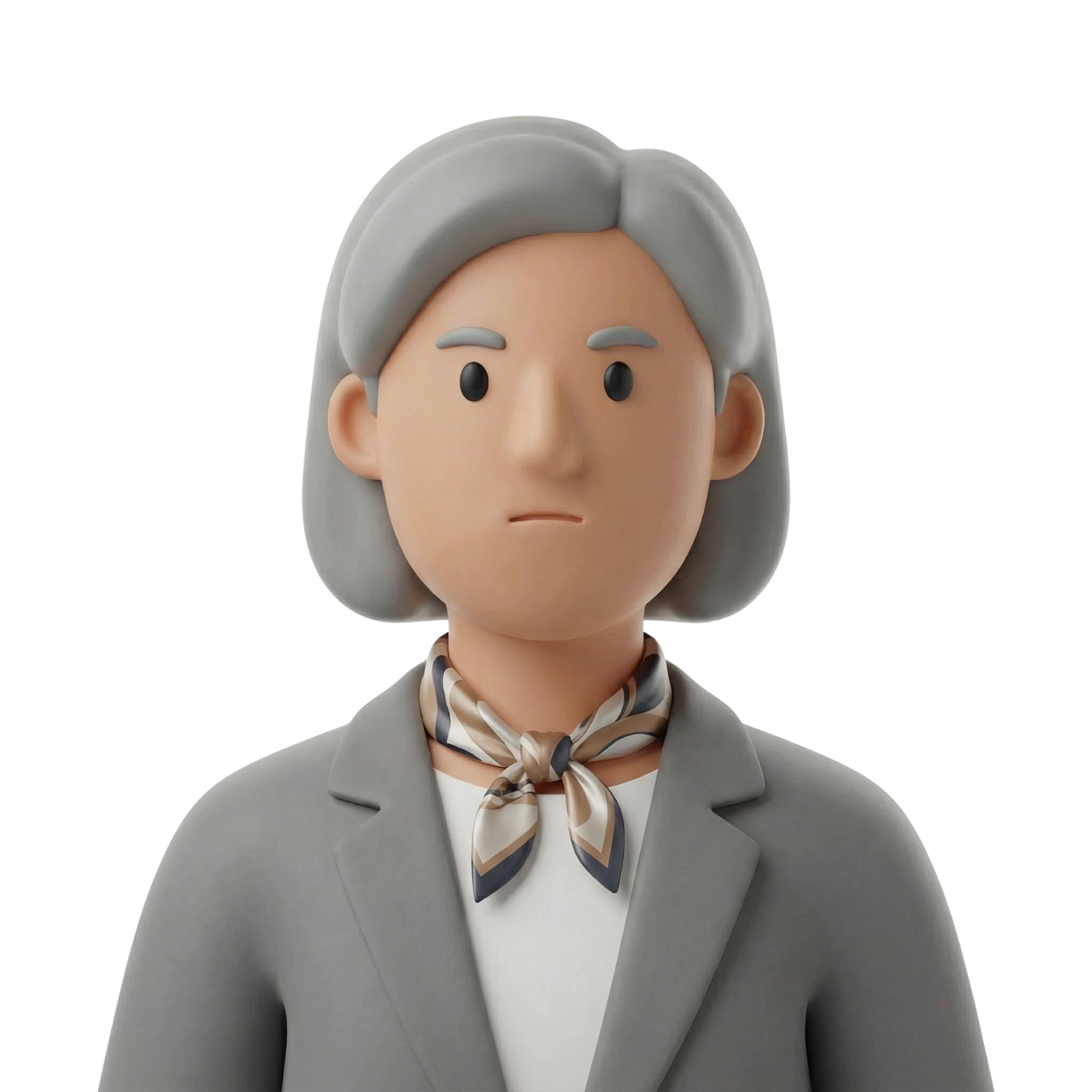 A focused corporate leader dressed in a classic gray suit and elegant neck scarf, embodying executive confidence and international business acumen.