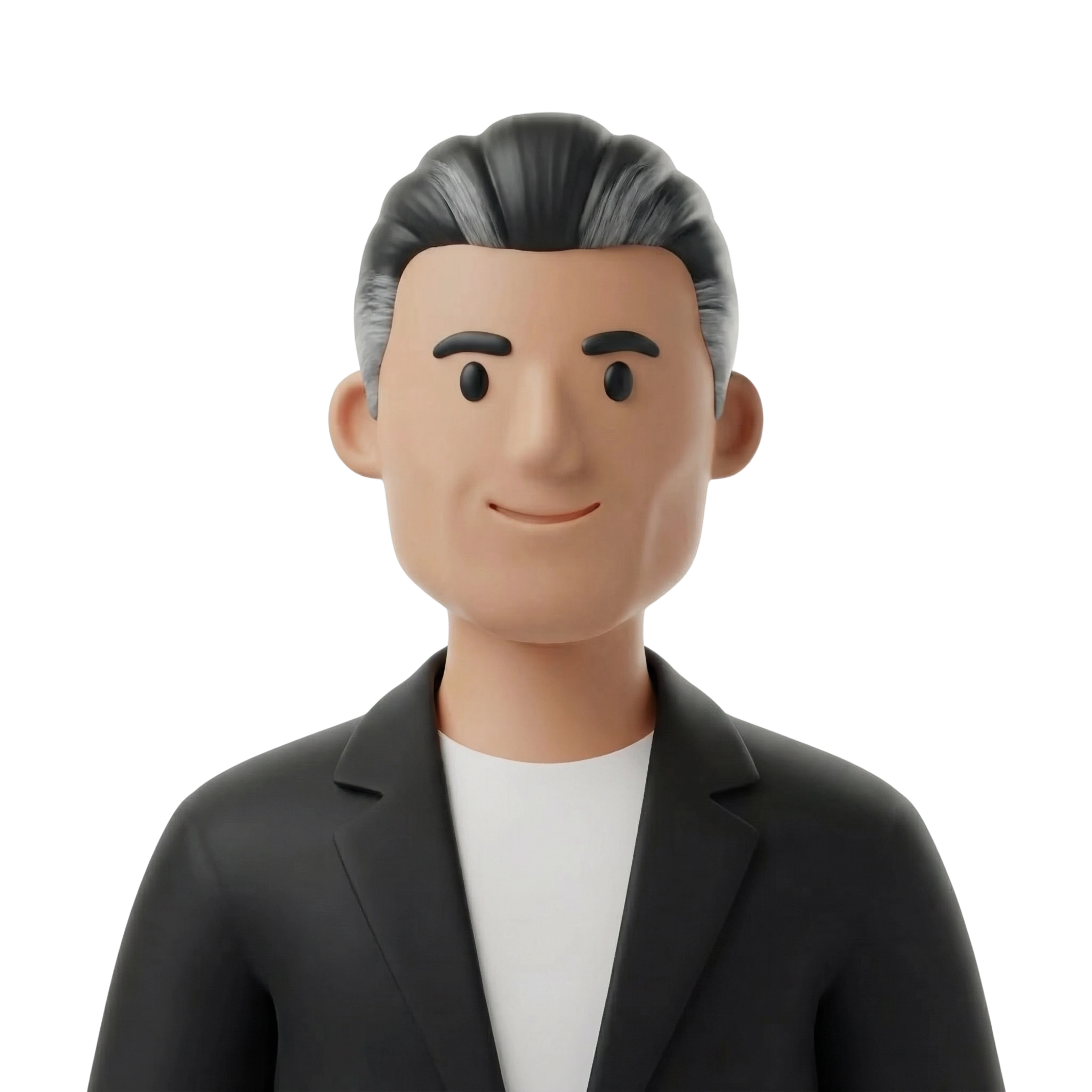 مدير تنفيذي واثق يظهر بأسلوب ثلاثي الأبعاد بسيط، يرتدي سترة أنيقة سوداء فوق قميص أبيض غير رسمي، يجسد القيادة والاحترافية في بيئة الأعمال المعاصرة.