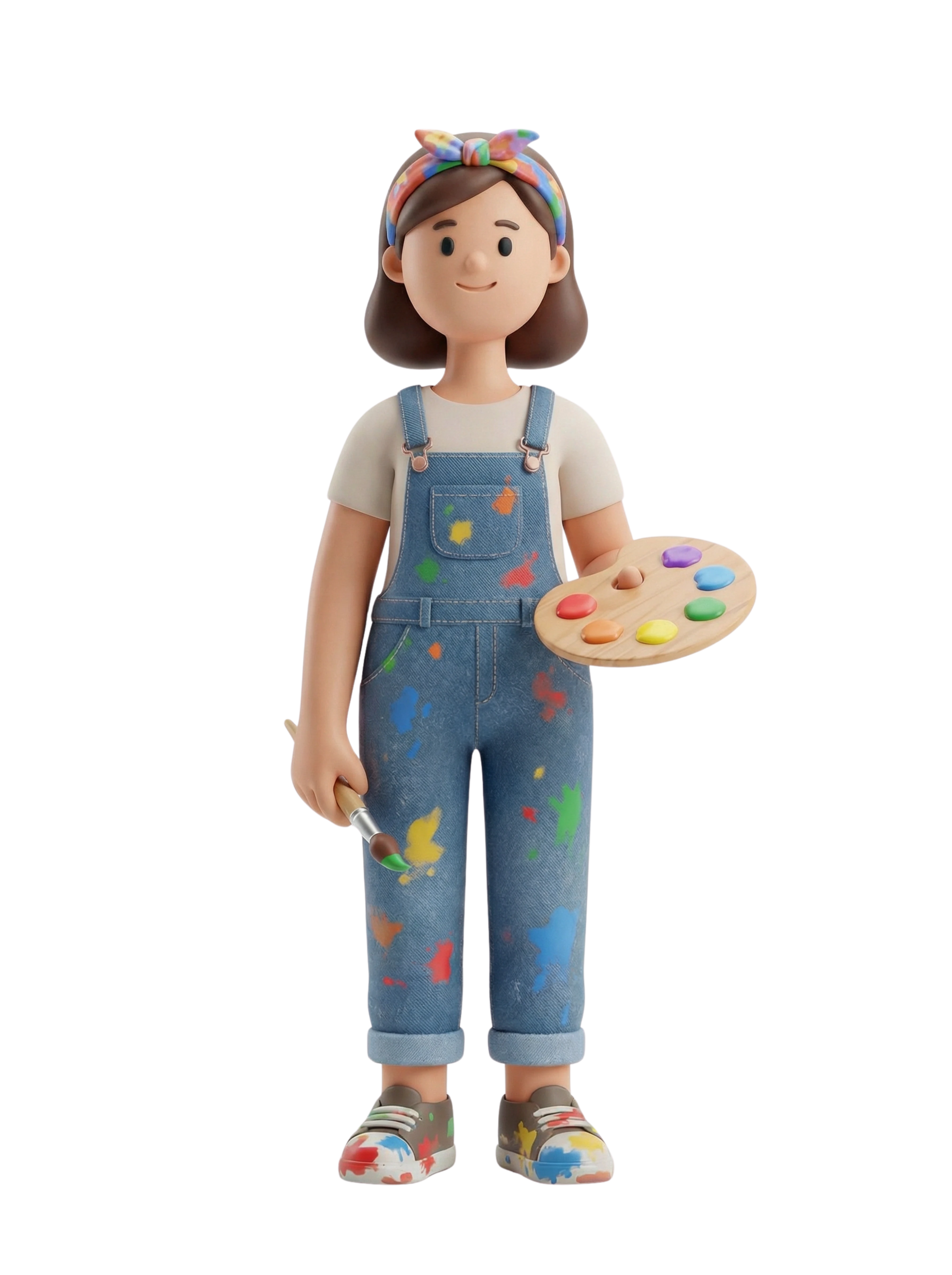A joyful artist passionately engaged in painting, dressed in playful overalls splashed with vibrant colors, capturing the spirit of creative expression.