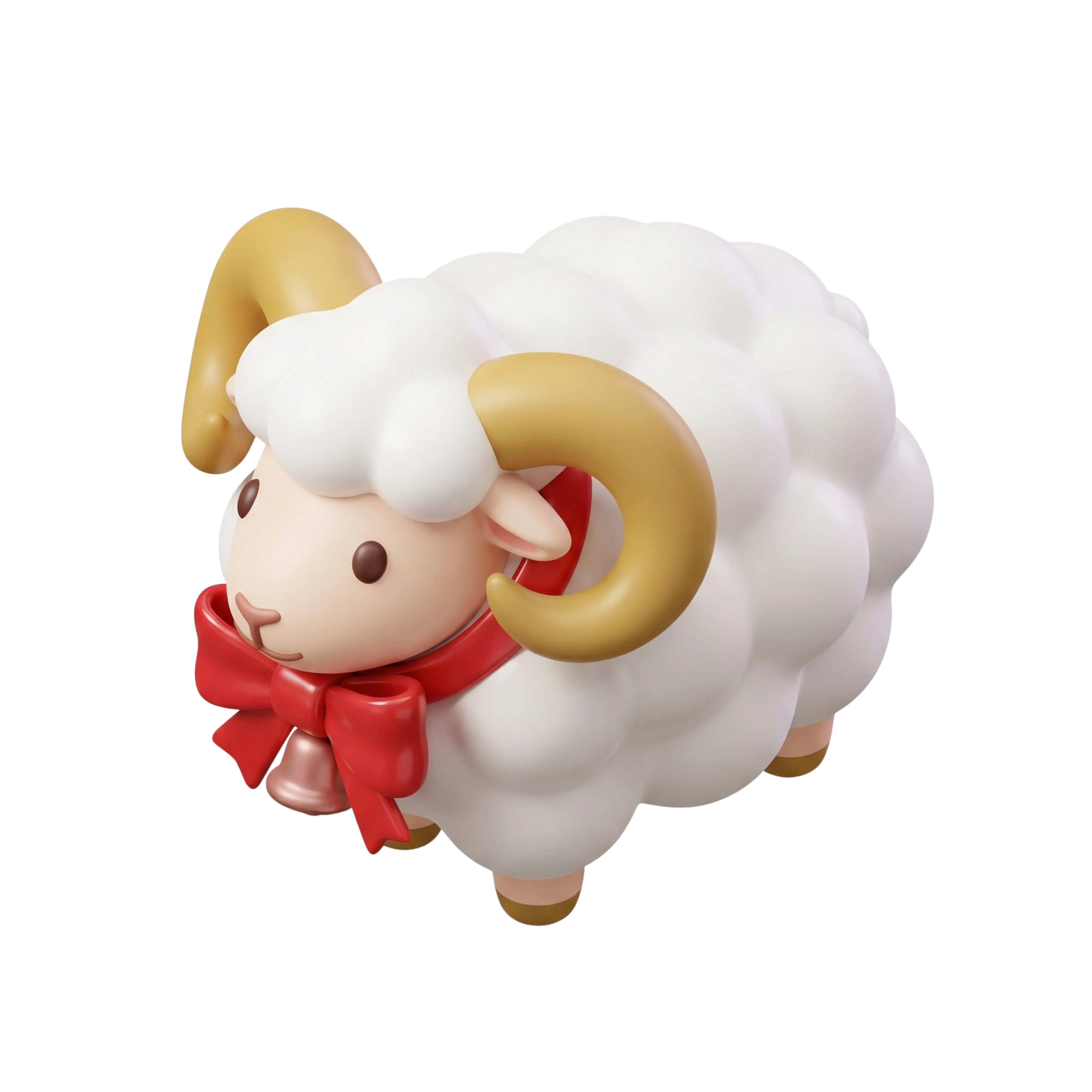 A playful and high-quality 3D render of an Eid sheep with a glossy white wool texture, gold-colored horns, and a bright red ribbon. Ideal for festive content, Eid al-Adha greeting cards, children’s media, and digital educational assets.
