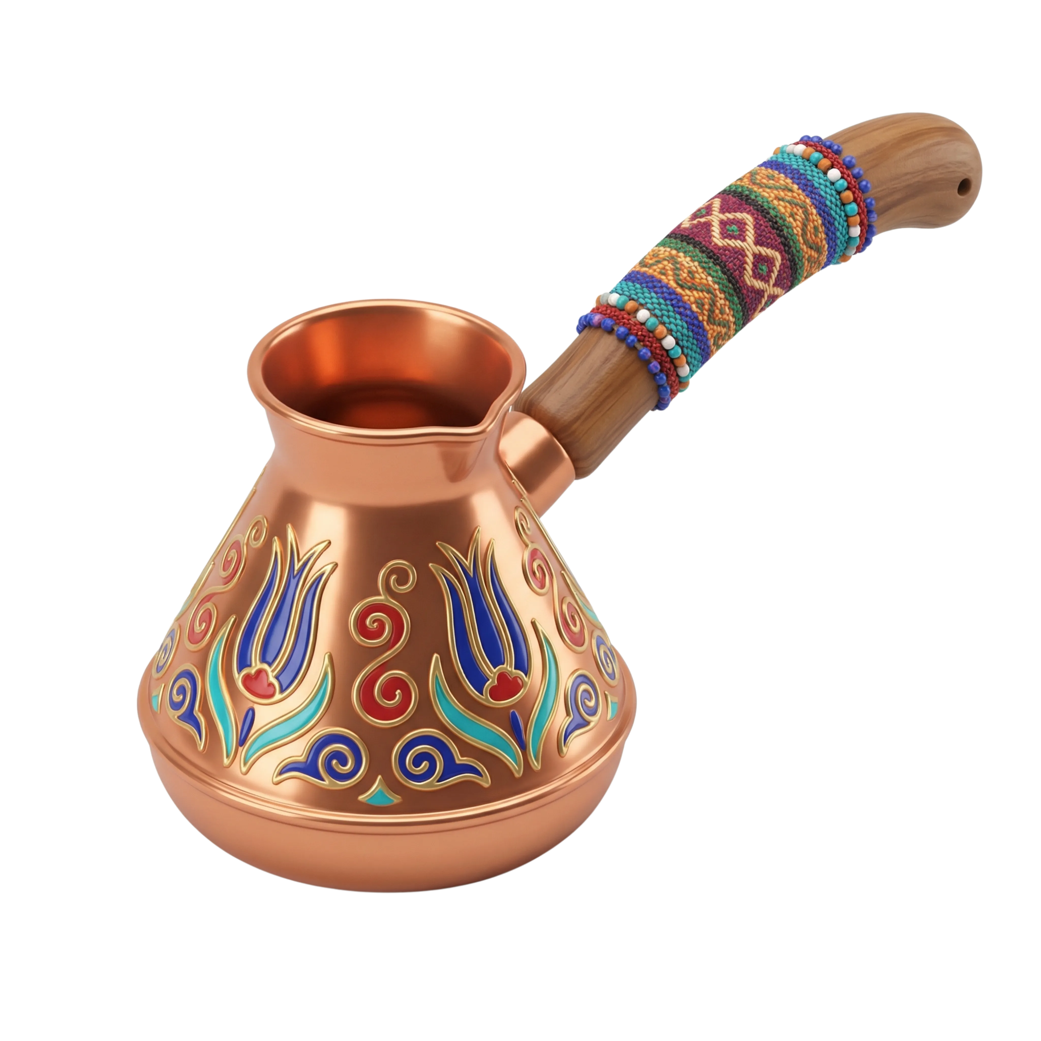 A detailed 3D rendered model of a traditional Turkish 'rakweh' or coffee pot made of metallic copper with intricate Ottoman-inspired floral patterns. The handle features colorful woodwork and beads, enhancing its cultural authenticity. Perfect for use in Middle Eastern hospitality, café branding, or cultural packaging designs.