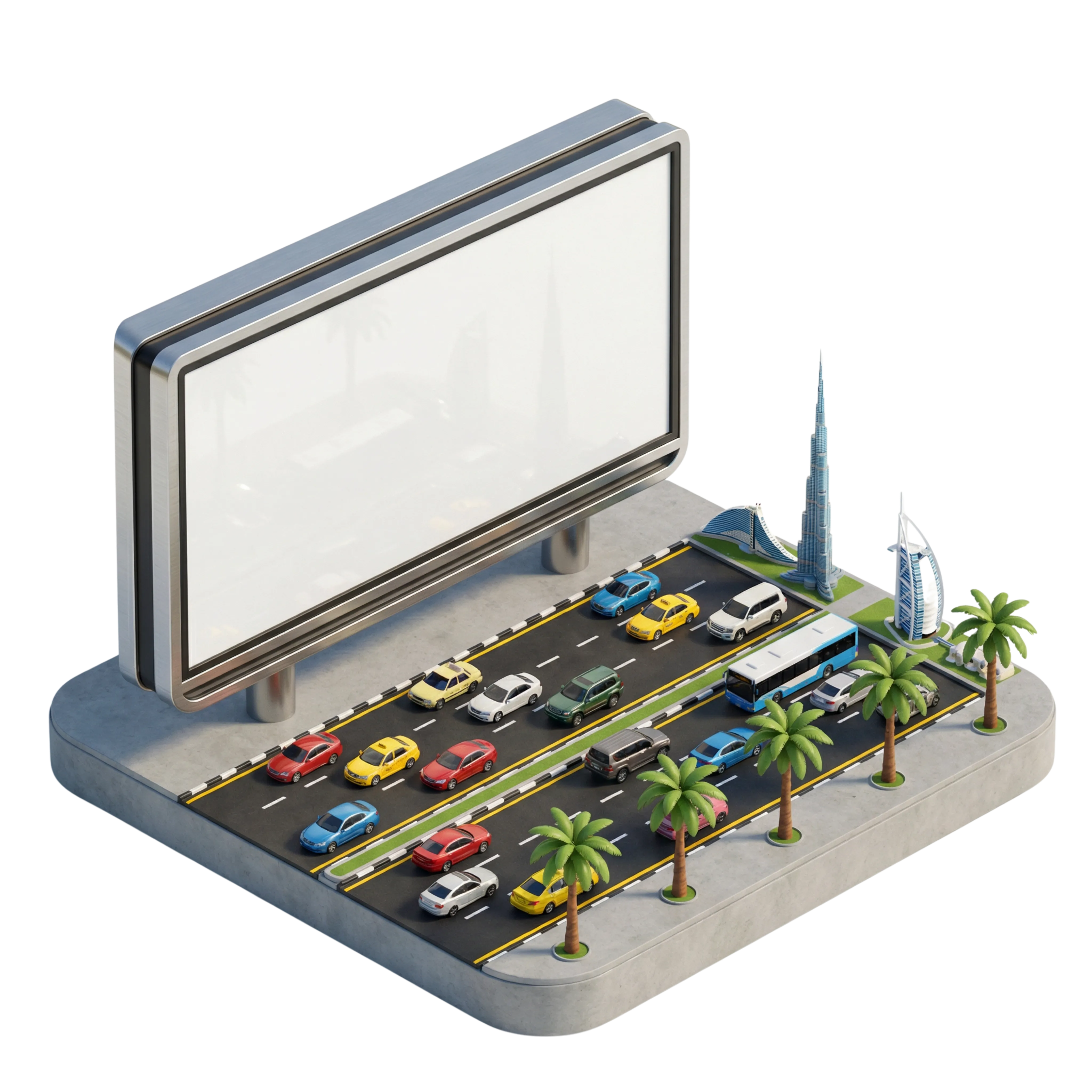 مجسم ثلاثي الأبعاد عالي الجودة لإعلان طرق معدني فوق مشهد مرور مستوحى من دبي، ويضم عناصر واقعية مثل السيارات، وأشجار النخيل، ومعالم شهيرة كبرج خليفة وبرج العرب. يتميز الإعلان بلمسة معدنية شبه لامعة، مما يجعله مناسباً لتصميم إعلانات الطرق أو محاكاة المدن أو مشاريع البنية التحتية.