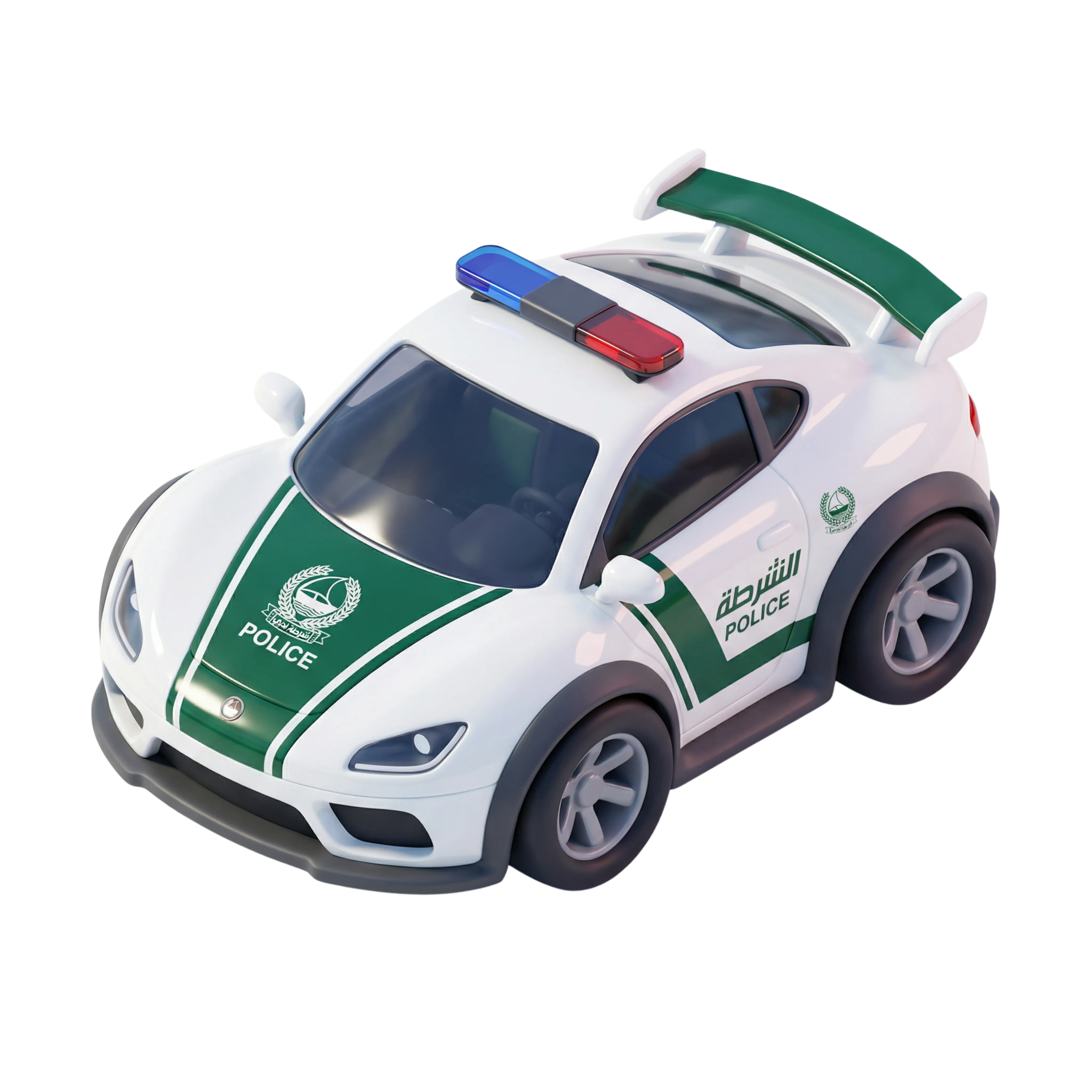 A high-quality 3D model of a Dubai Police car featuring a sleek, glossy exterior with signature green and white colors and Arabic-English decals. The emergency light bar enhances the realism, making it ideal for UI elements, game assets, traffic simulations, or educational visuals related to law enforcement in the UAE.