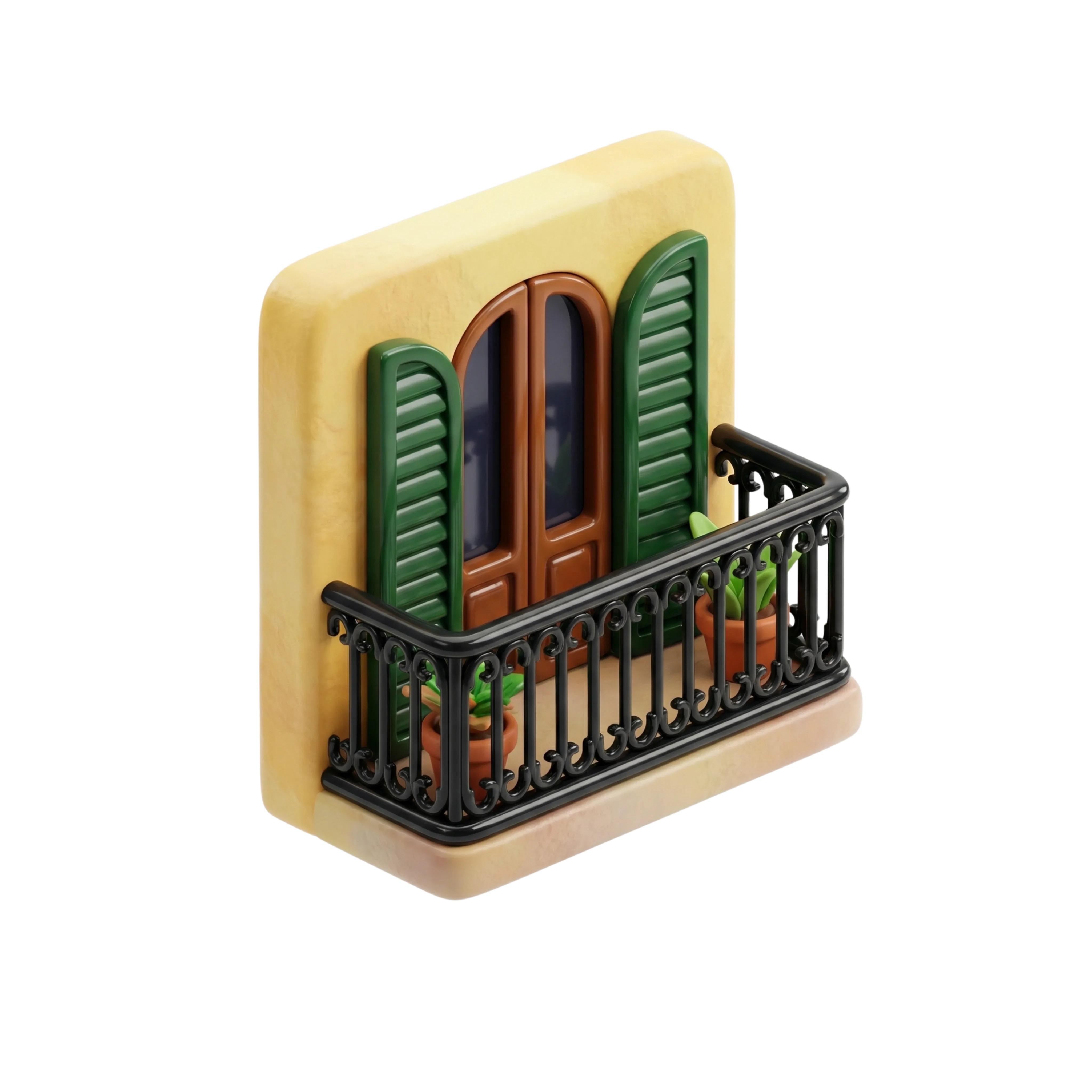 A high-quality 3D render of a traditional Egyptian balcony with distinctive green wooden shutters, terracotta plant pots, and a black wrought iron railing. Crafted with a matte finish, this asset is ideal for cultural architectural visualizations, game environments, or themed graphic designs reflecting urban Egyptian streetscapes.