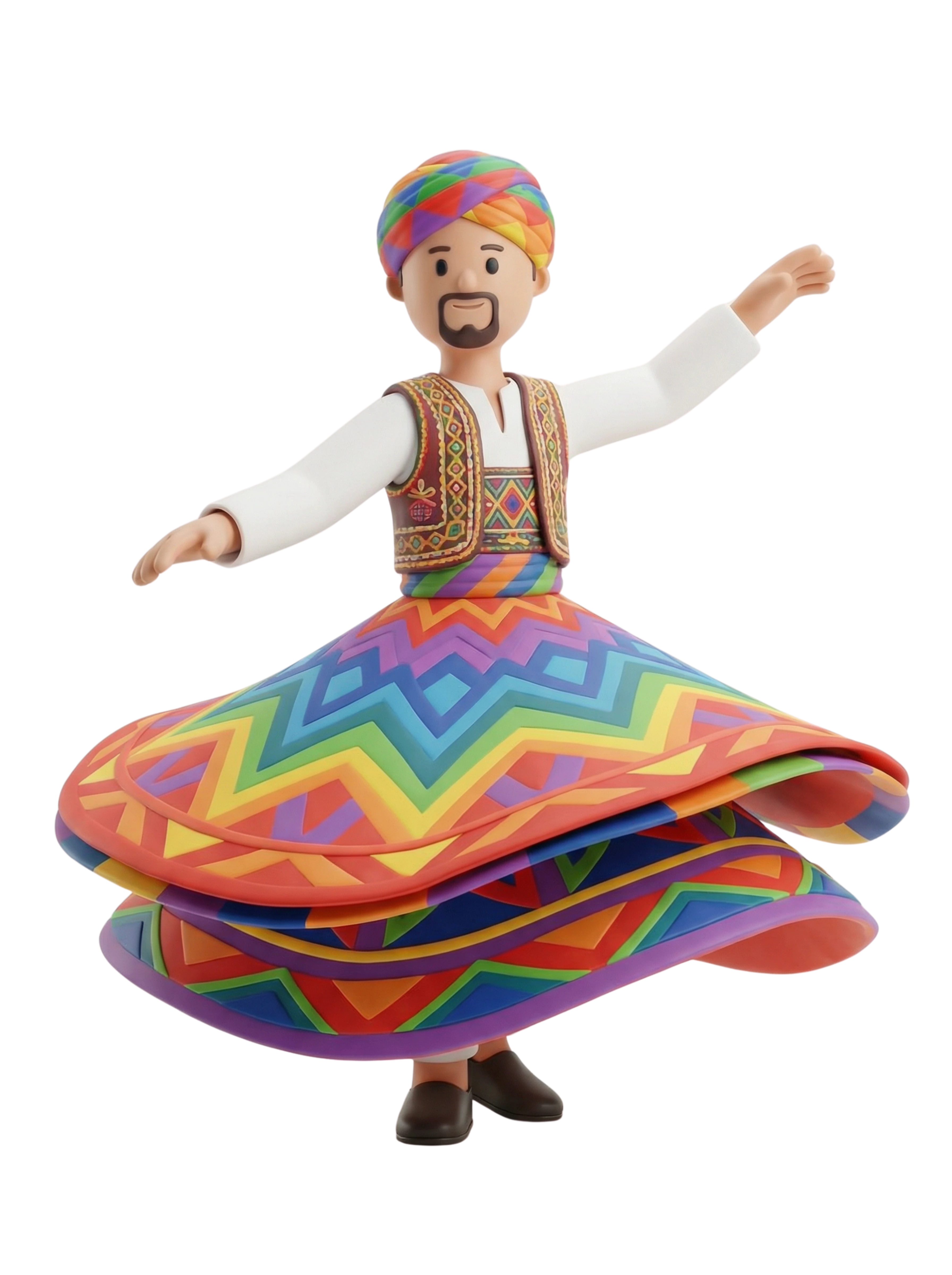 راقص تنورة نابض بالحياة يؤدي رقصة فولكلورية مصرية مستوحاة من التراث الصوفي، تتميز بتنورات دوارة ملونة وحركات يدوية معبرة.