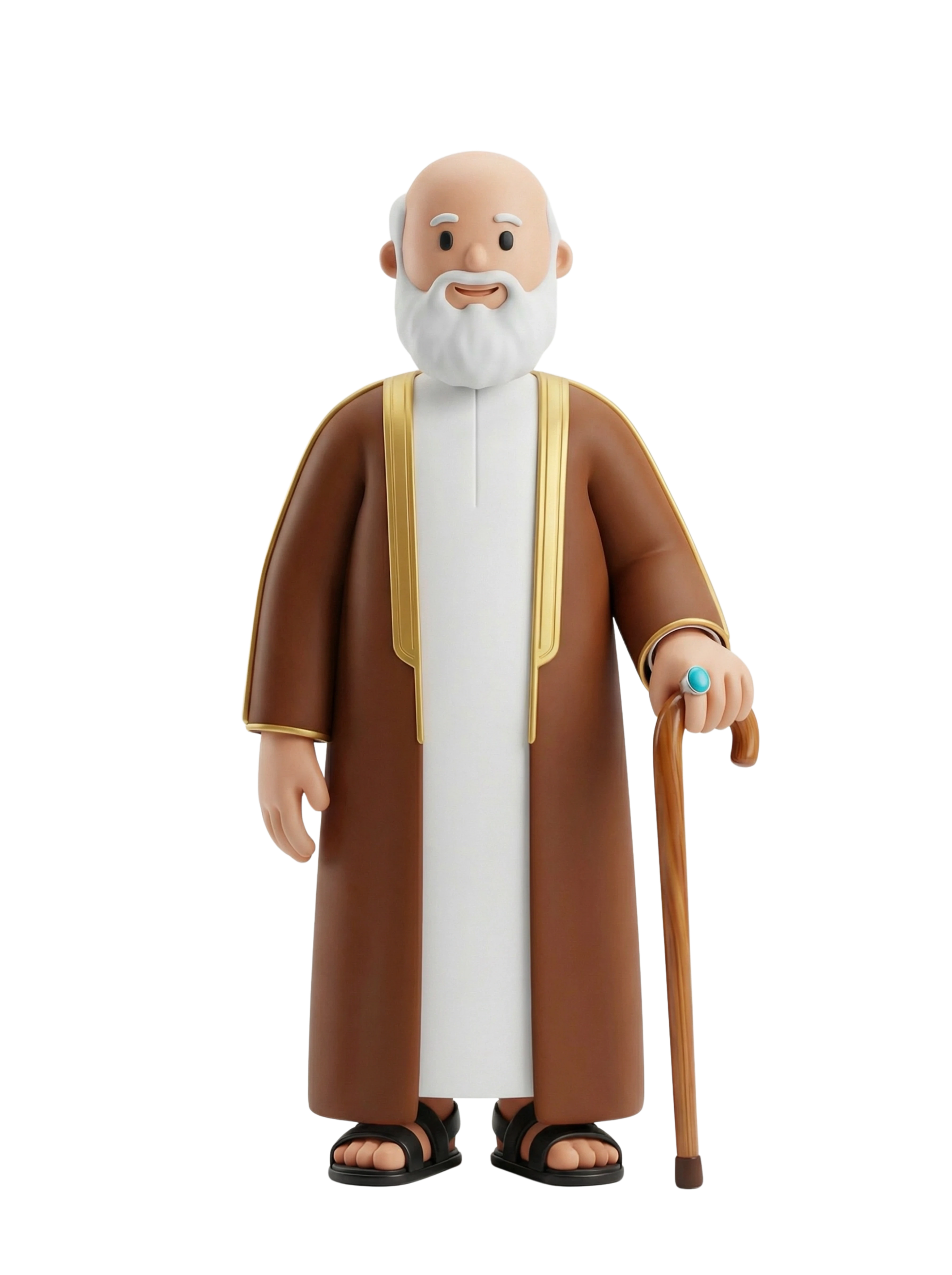 يقف رجل مسن بوقار مرتديًا الزي الخليجي التقليدي، حيث يلبس بشت بني مطرز بالذهب فوق ثوب أبيض. يرافقه عصا خشبية ويعكس مظهره الهدوء والحكمة وقيم الاحترام داخل المجتمع والأسرة.