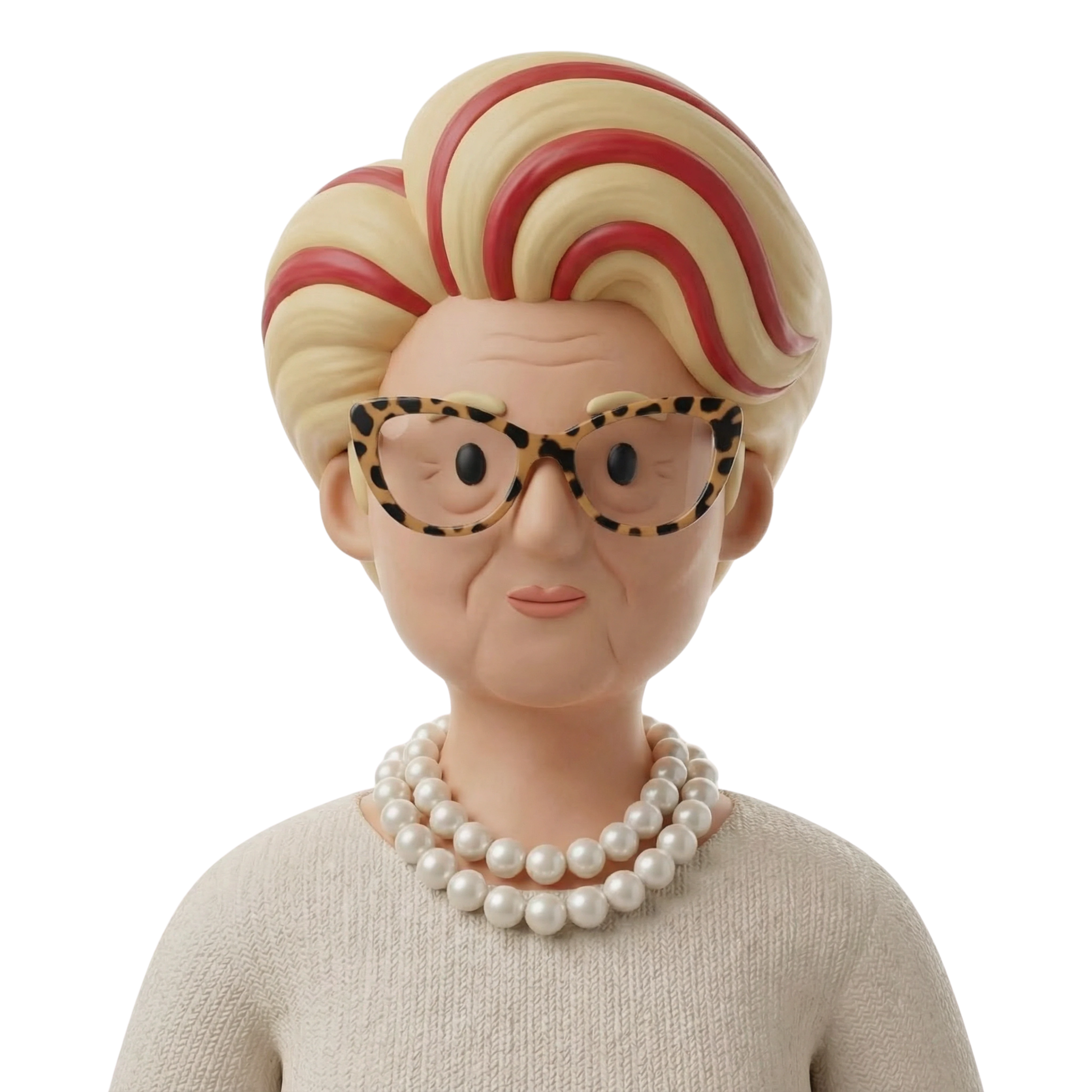 A dignified woman exuding timeless style with her iconic vintage hairstyle and elegant pearls, portraying the essence of refined seniority in a cosmopolitan setting.