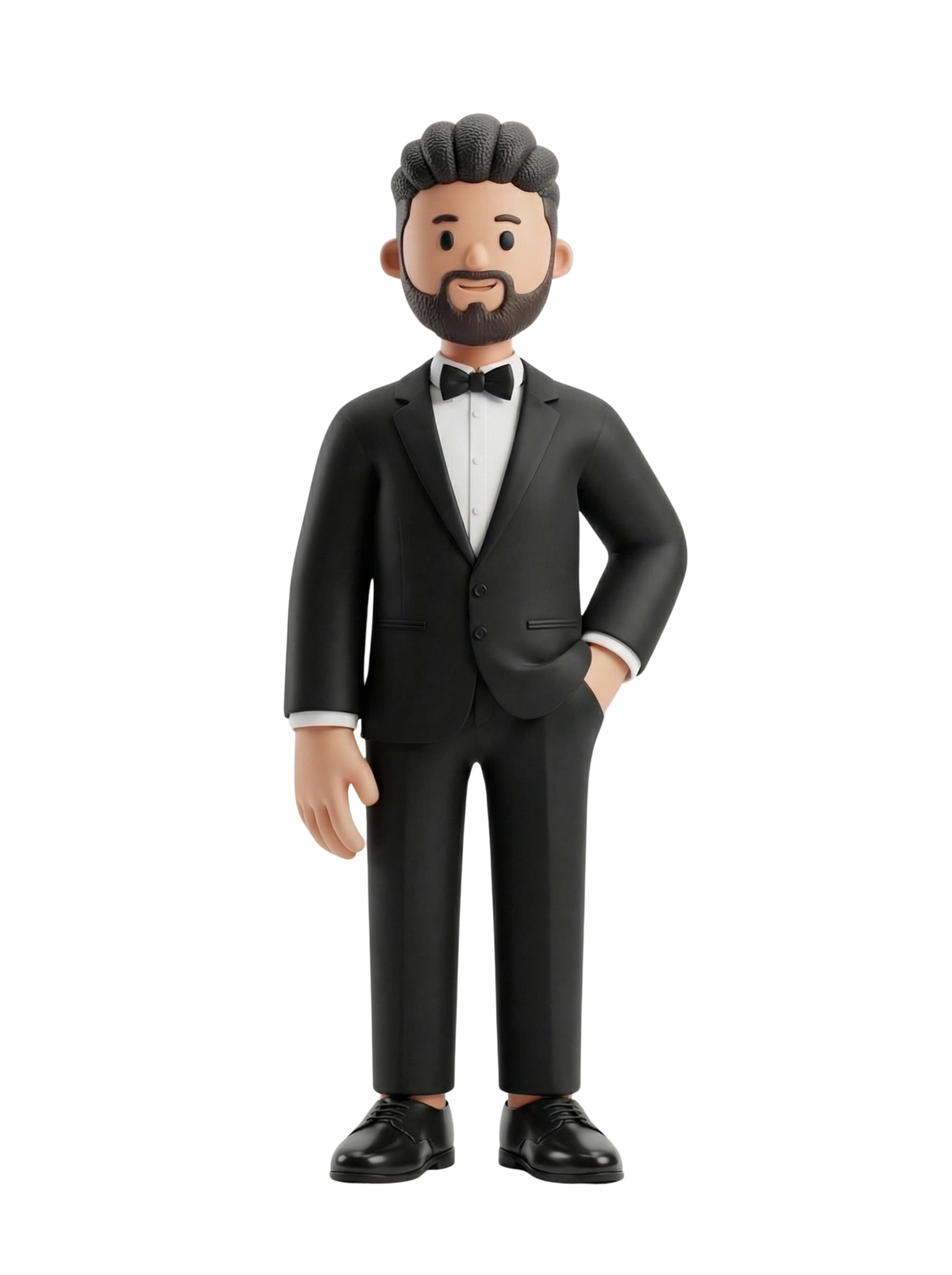 ضيف زفاف أنيق يتمتع بسحر ورُقي ببدلة رسمية سوداء وربطة عنق فراشة، يجسد أناقة الأزياء الكلاسيكية في مناسبة احتفالية.