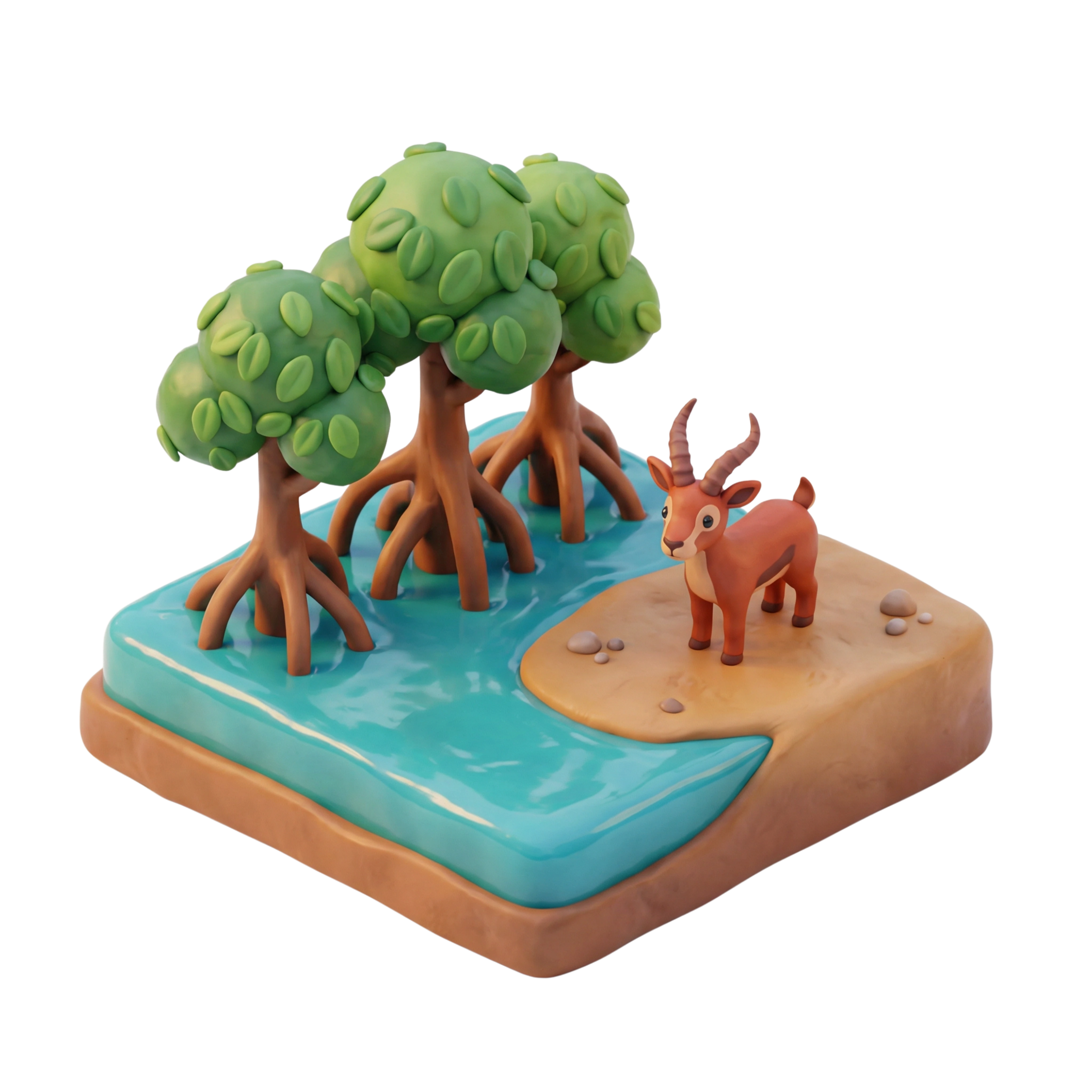 مشهد هادئ يصور النظام البيئي الساحلي في جزر فرسان، حيث تظهر غابات المانغروف الشهيرة التي تُعد موطناً مهماً للحياة البحرية المتنوعة والطيور المهاجرة. تقع جزر فرسان قبالة الساحل الجنوبي للمملكة العربية السعودية في البحر الأحمر، وتُعرف بغناها البيئي وتراثها الثقافي. وتعكس الغزال العربي الرشيق تميّز التنوع الحيوي في هذه المنطقة.