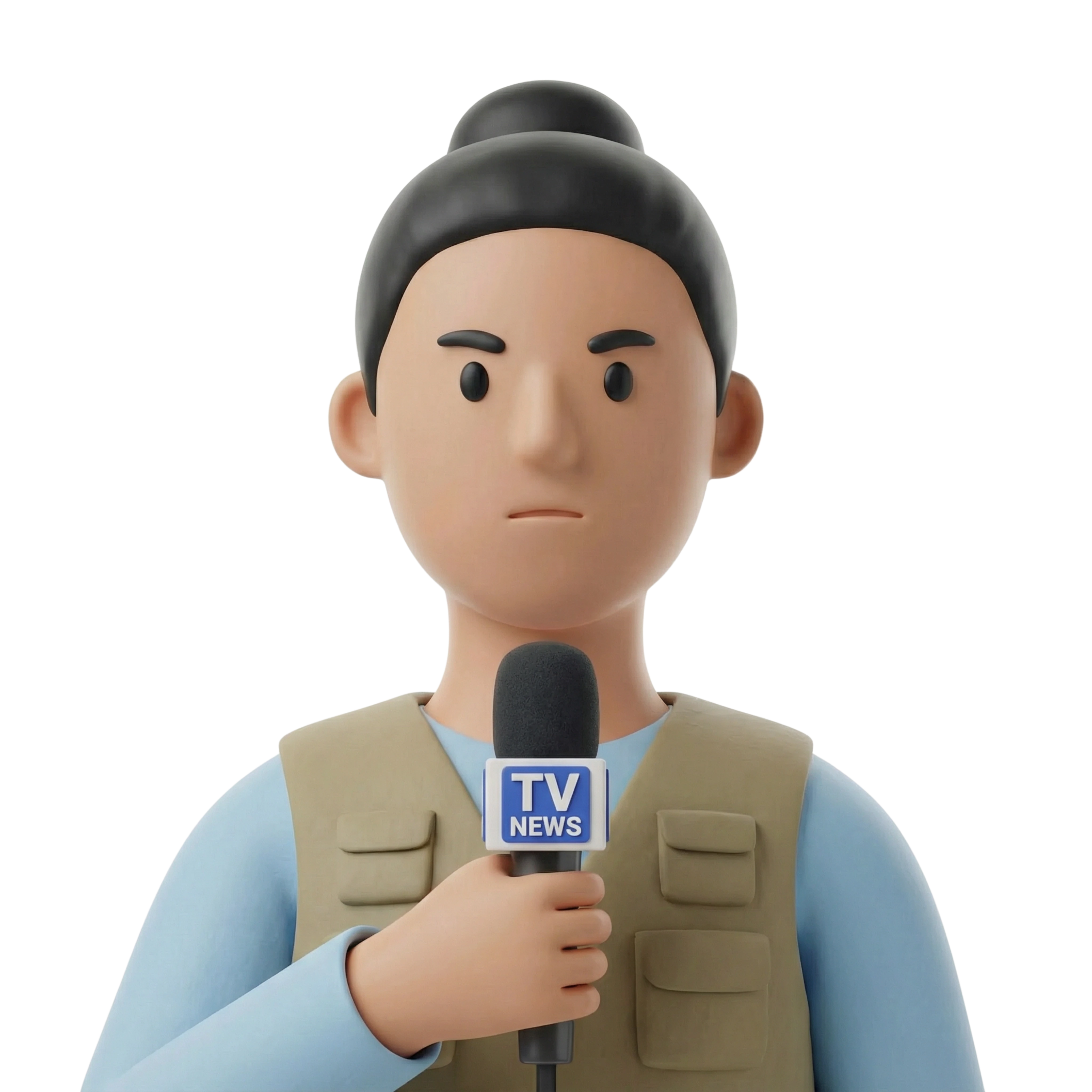 مراسلة ميدانية مخلصة تقدم آخر الأخبار العاجلة وهي ترتدي زيًا صحفيًا عالميًا كلاسيكيًا، تجسد الاحترافية والنزاهة الصحفية.