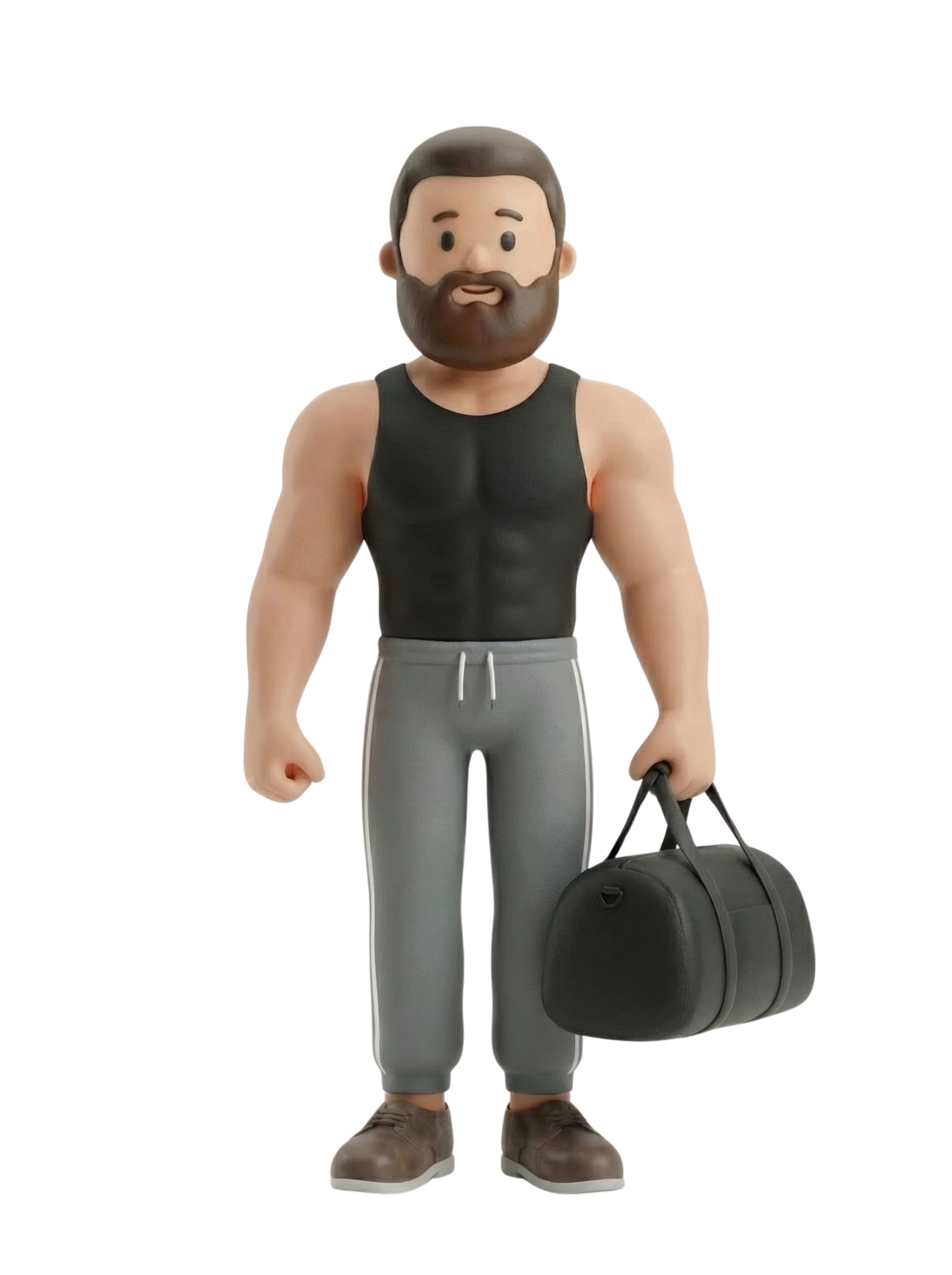 ممارس رياضة ملتزم يعكس ثقافة اللياقة العصرية، يرتدي ملابس رياضية مريحة ومستعد لحصة تدريبية ممسكاً بحقيبة النادي.
