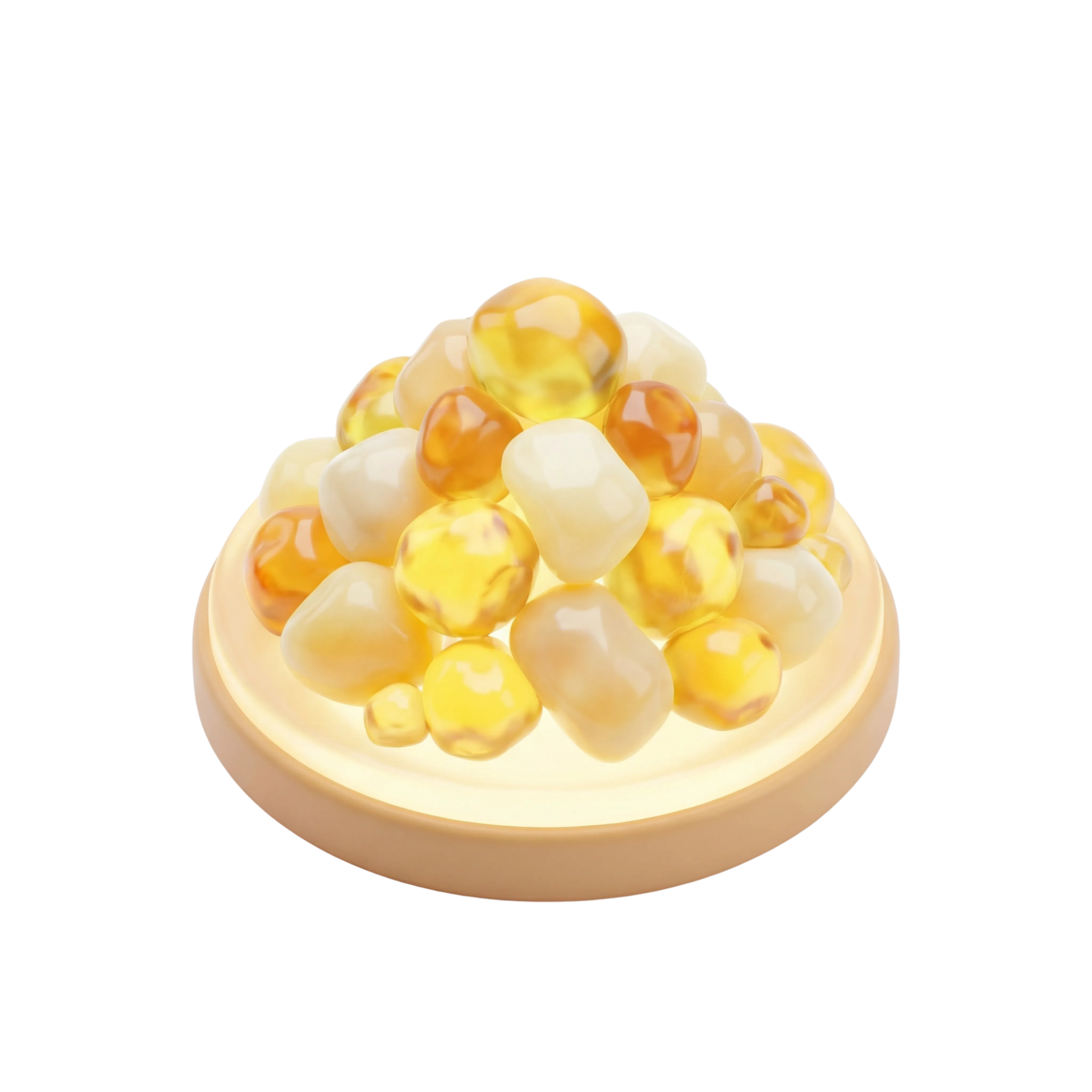 مجسم ثلاثي الأبعاد عالي الجودة للبان الذكر، يتميز بحبيبات شبه شفافة ولامعة من درجات العنبر واللون الأبيض، يعكس مظهرًا واقعيًا للعنصر الشهير في الثقافة العمانية، مناسب لتصاميم العطور والعلاج بالأعشاب أو المنتجات التقليدية.