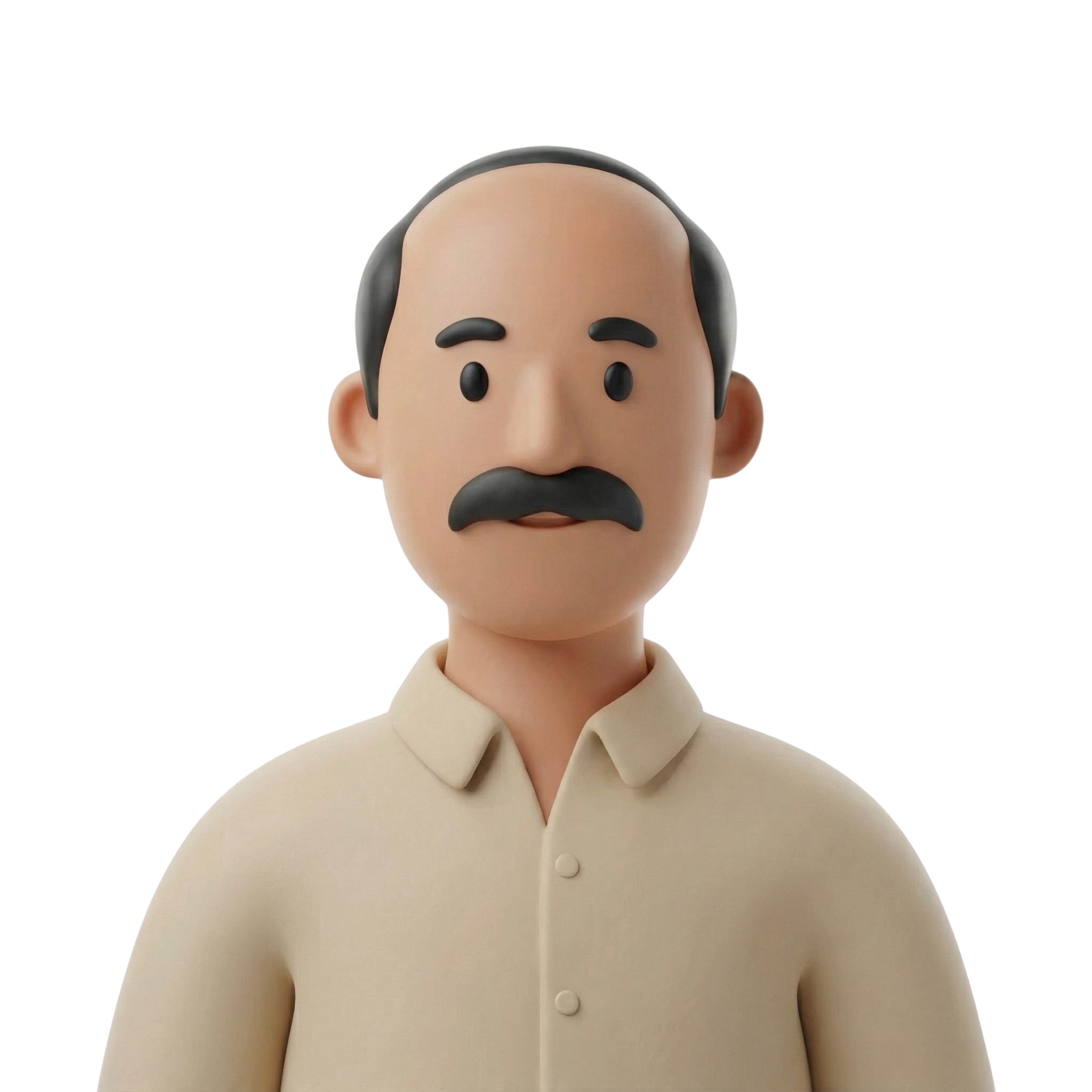 شخصية أب ودود بملامح هادئة يرتدي قميصاً تقليدياً بلون بيج، يعكس أسلوباً ثقافياً شائعاً في بيوت بلاد الشام. تعبر ملامحه عن التواضع والأصالة وروح العائلة.
