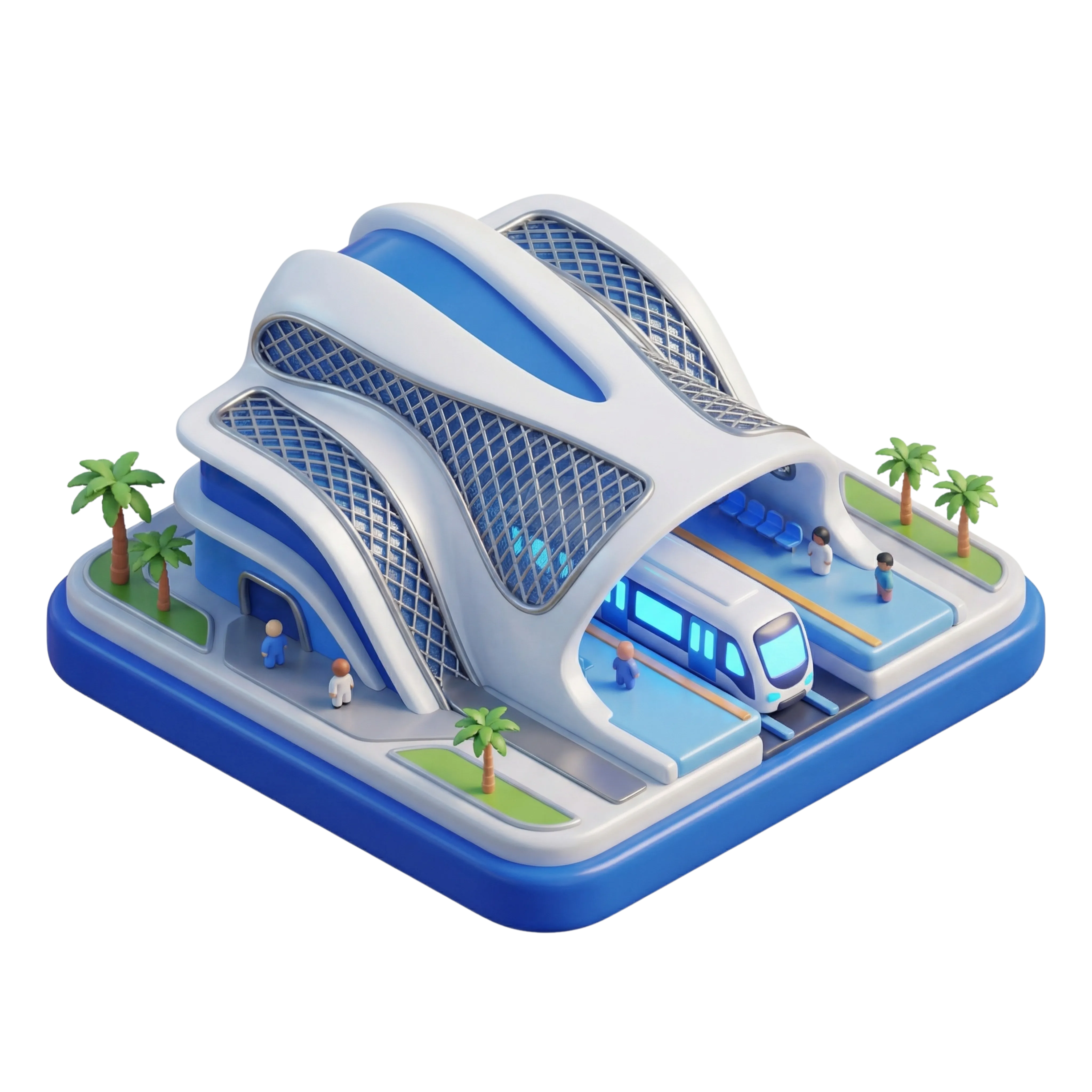 A high-quality 3D render of a futuristic metro station with a glossy white and blue architectural design, featuring curved facades, mesh detailing, and palm tree decorations. This model is ideal for urban-themed designs, transport apps, animations, and city infrastructure illustrations.