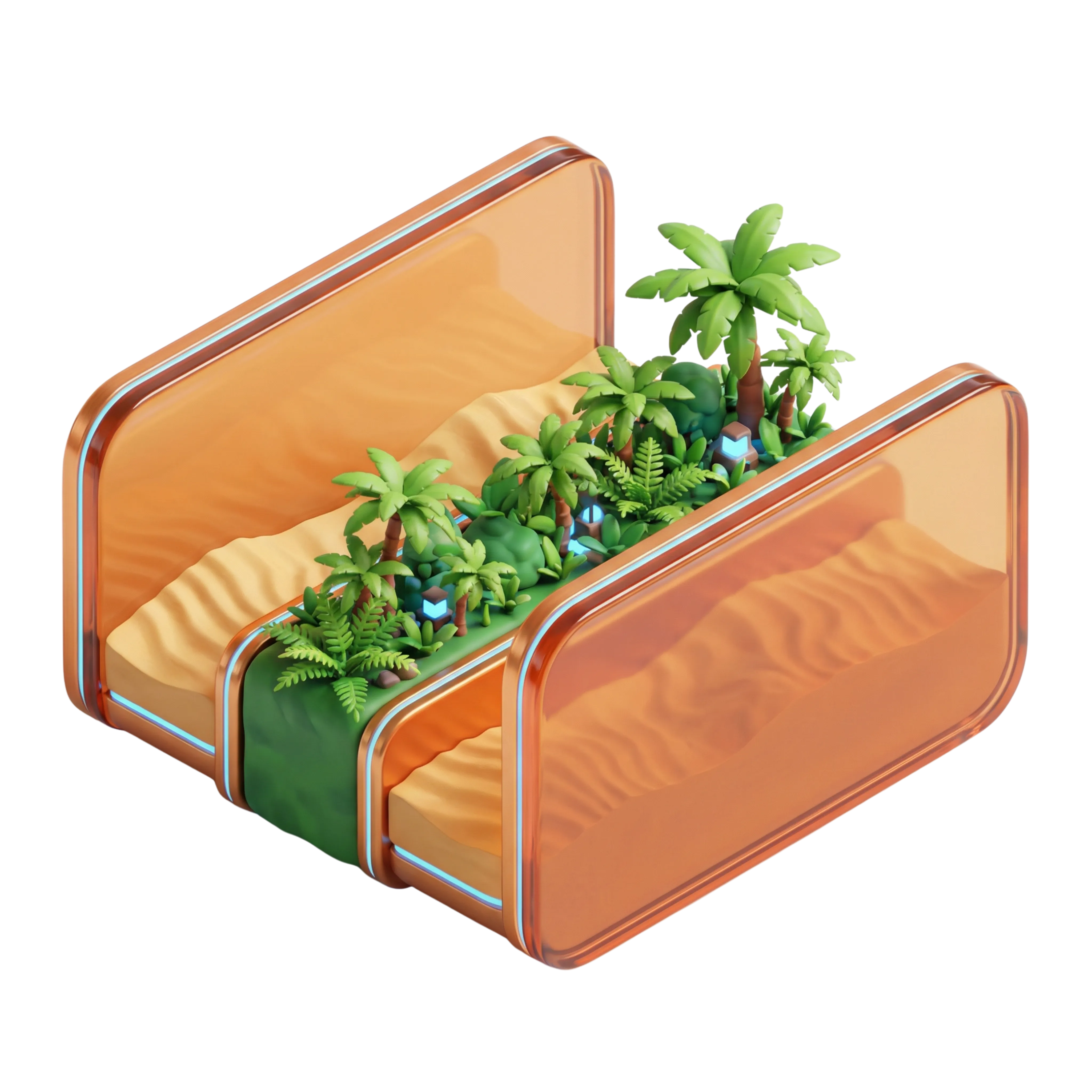 This 3D render showcases a highly stylized and glossy representation of NEOM's 'The Line', a futuristic urban development in Saudi Arabia. The model features a sand and palm-lined corridor enclosed in sleek, transparent panels, symbolizing sustainability and innovation. Ideal for presentations on smart cities, urban planning, or visionary architecture.