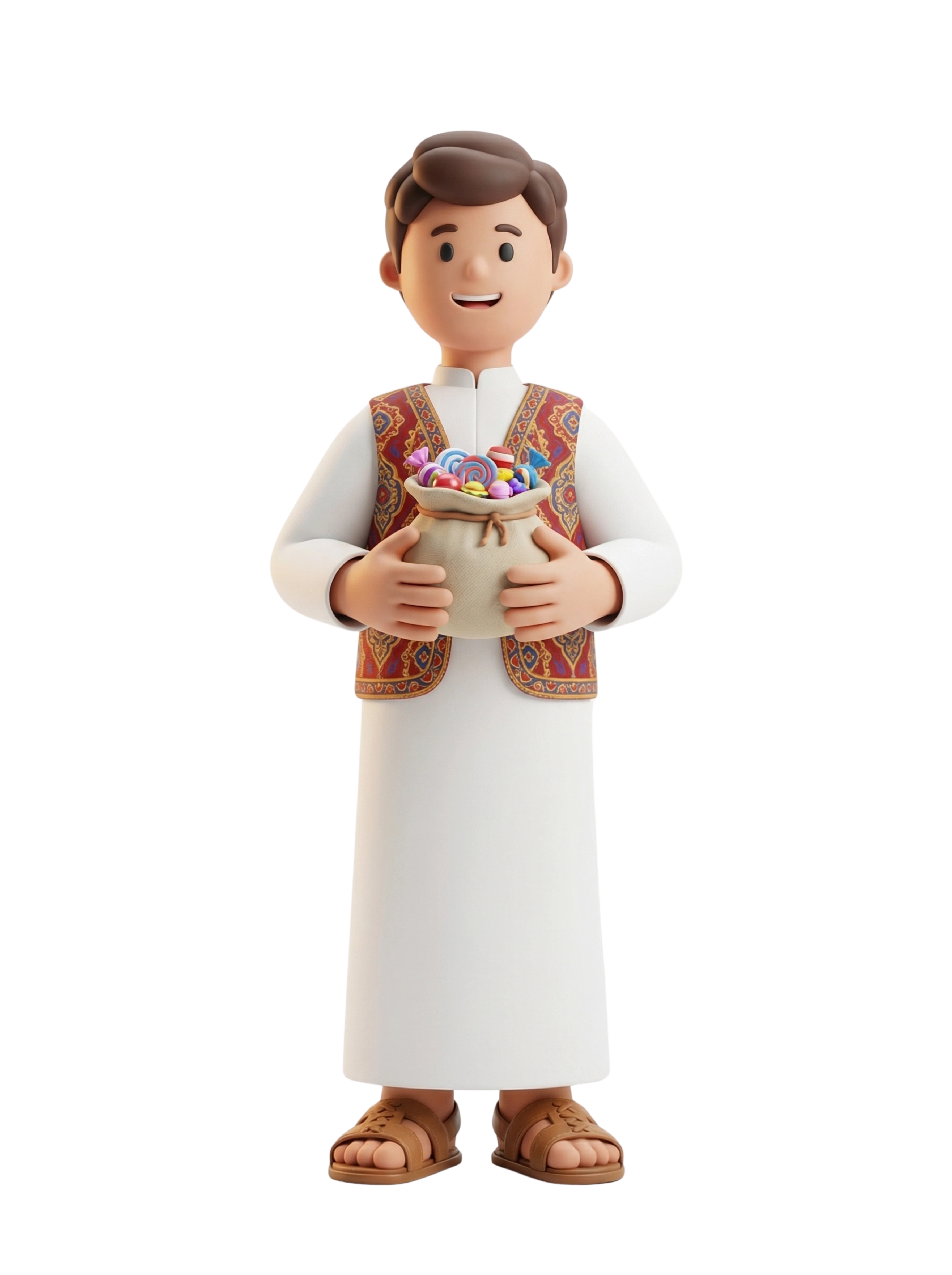 A cheerful boy dressed in traditional Gulf attire holding a candy bag, celebrating Gargee'an—an iconic kids' festival marked by songs, sweets, and cultural pride across the Gulf region.