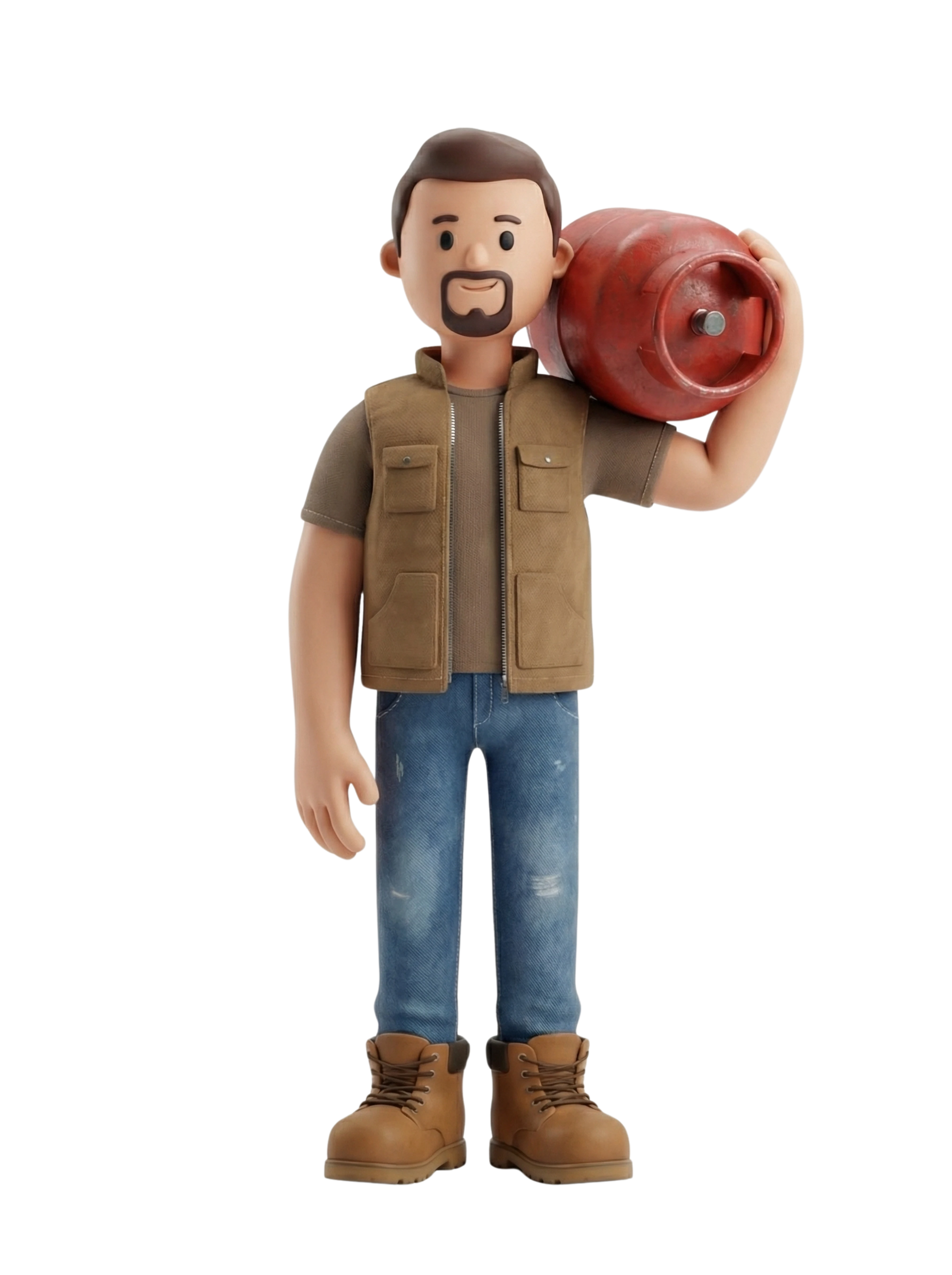 عامل توصيل غاز مجتهد يحمل أسطوانة غاز ثقيلة بسهولة، مرتديًا ملابس عملية مناسبة للعمل الميداني والمهام اليومية.