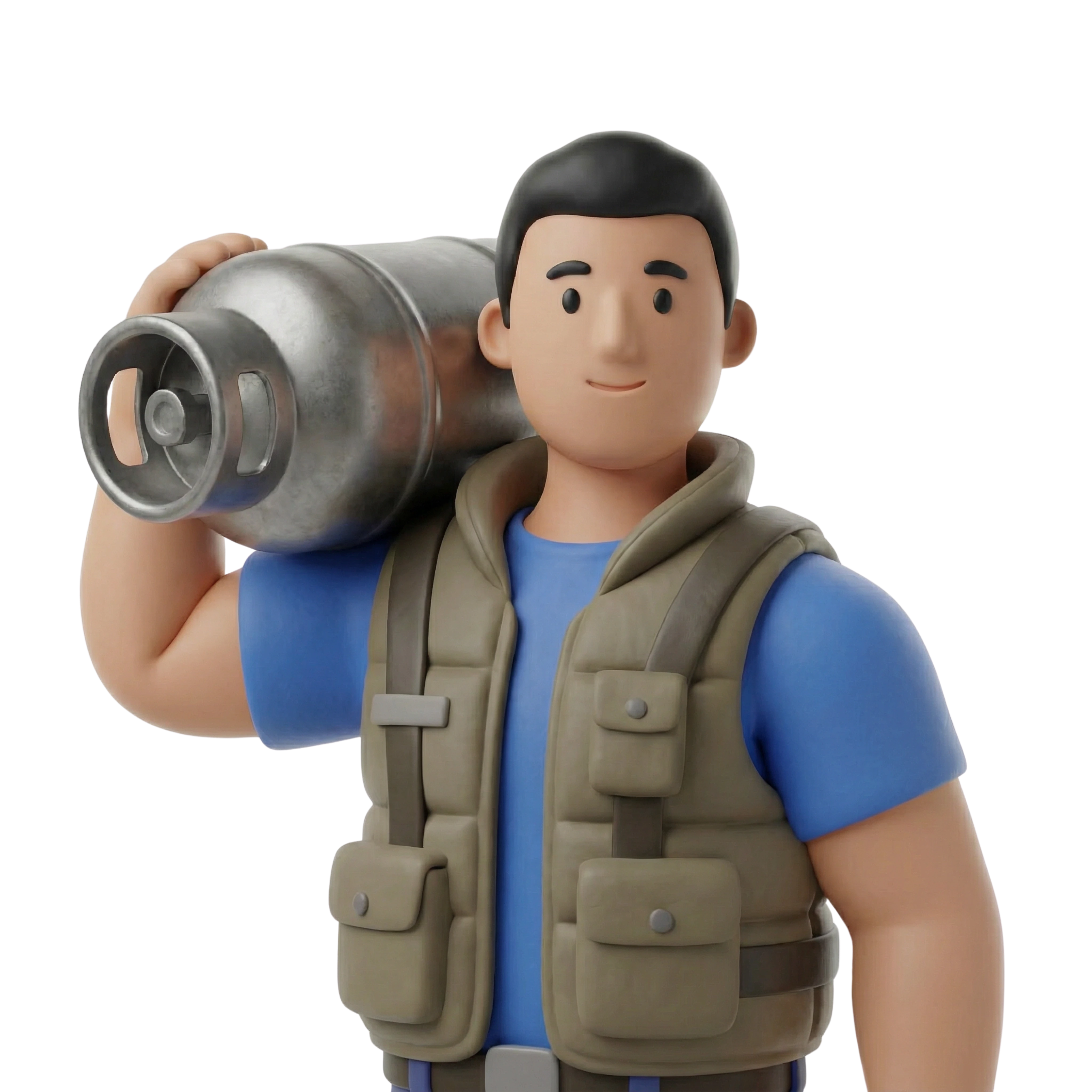 عامل توصيل غاز ودود يحمل أسطوانة غاز بثقة، يمثل خدمات المرافق الأساسية في بيئة حضرية عصرية.