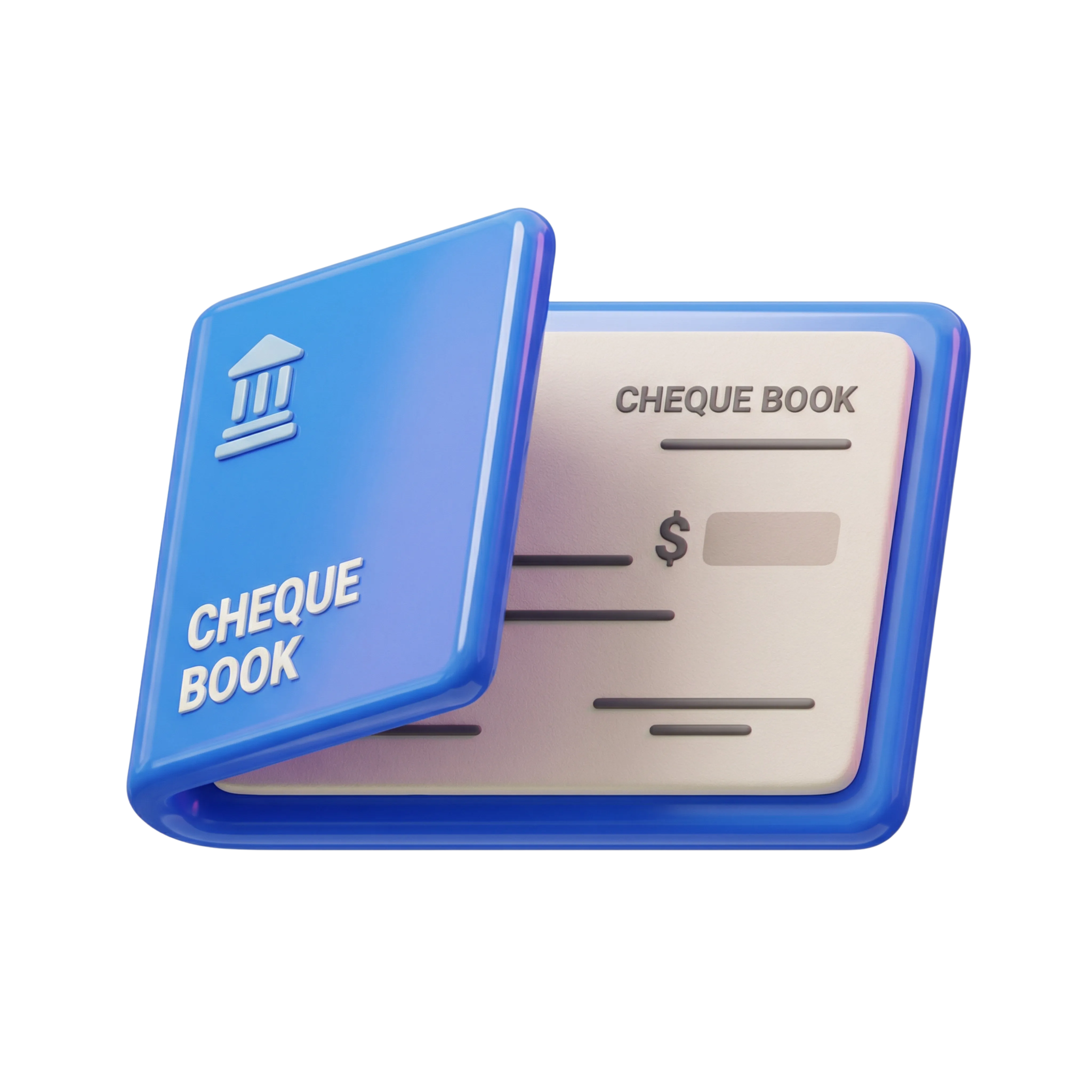 A high-quality 3D render of a stylized cheque book icon featuring a glossy blue cover and a metallic-textured inner page, ideal for use in finance apps, user interfaces, banking dashboards, and fintech presentations.
