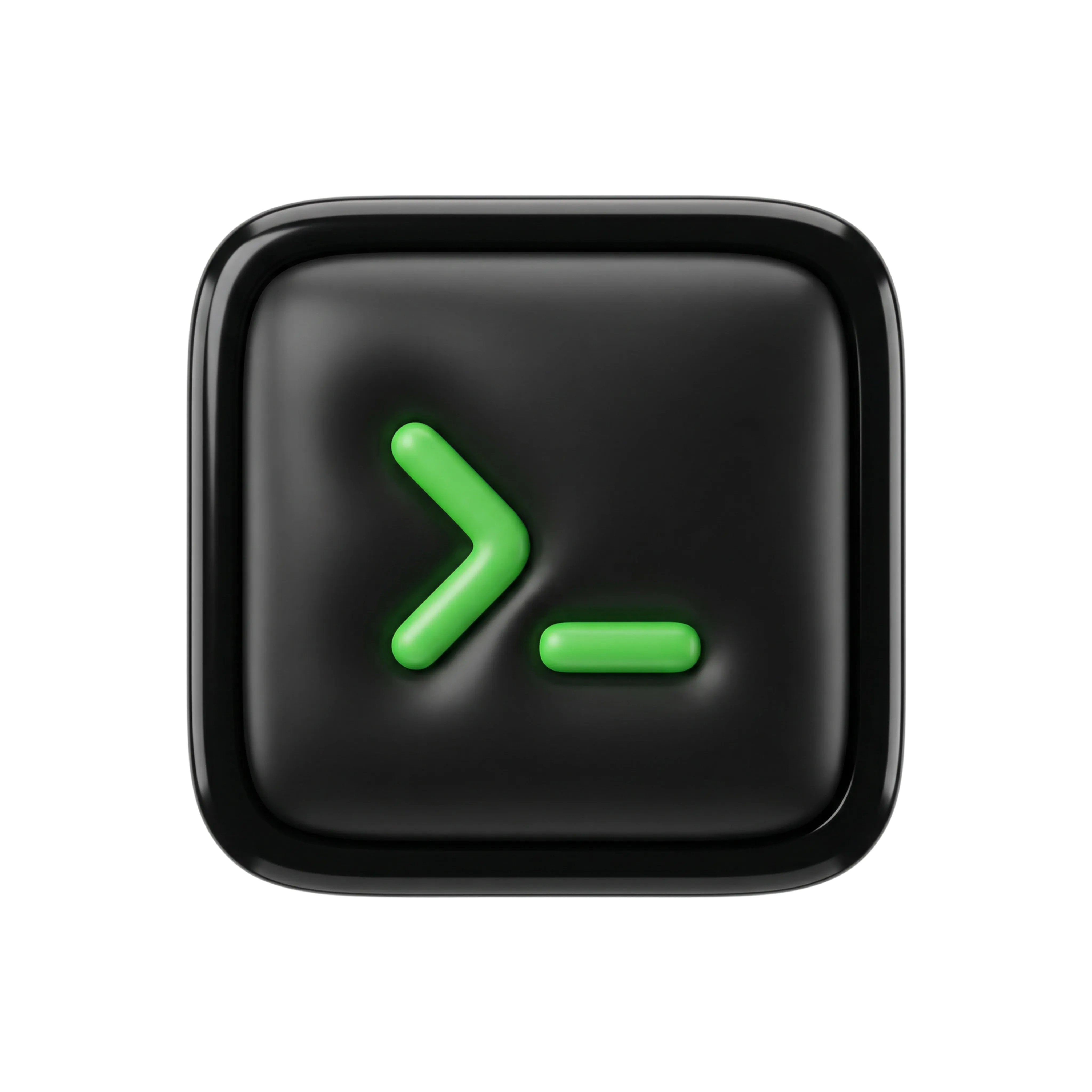 مجسم ثلاثي الأبعاد عالي الجودة لأيقونة طرفية أوامر بتشطيب أسود لامع ورموز خضراء مضيئة. مثالي لتصاميم واجهات المستخدم وبرامج البرمجة والمشاريع التعليمية في مجال التقنية.