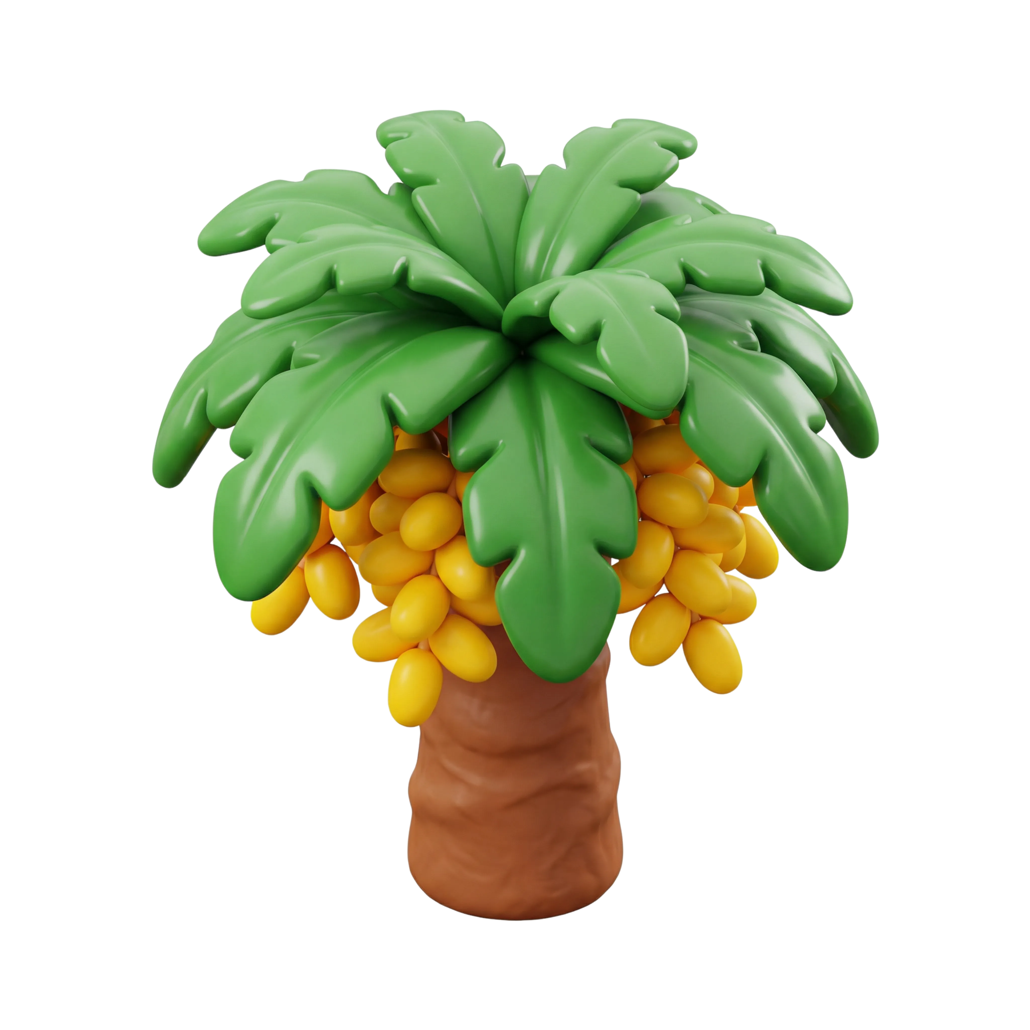 A high-quality 3D render of a stylized date palm tree with glossy green fronds, vibrant yellow dates, and a matte-textured brown trunk. Ideal for regional UI designs, educational materials, cultural applications, or themed presentations related to the Middle East.