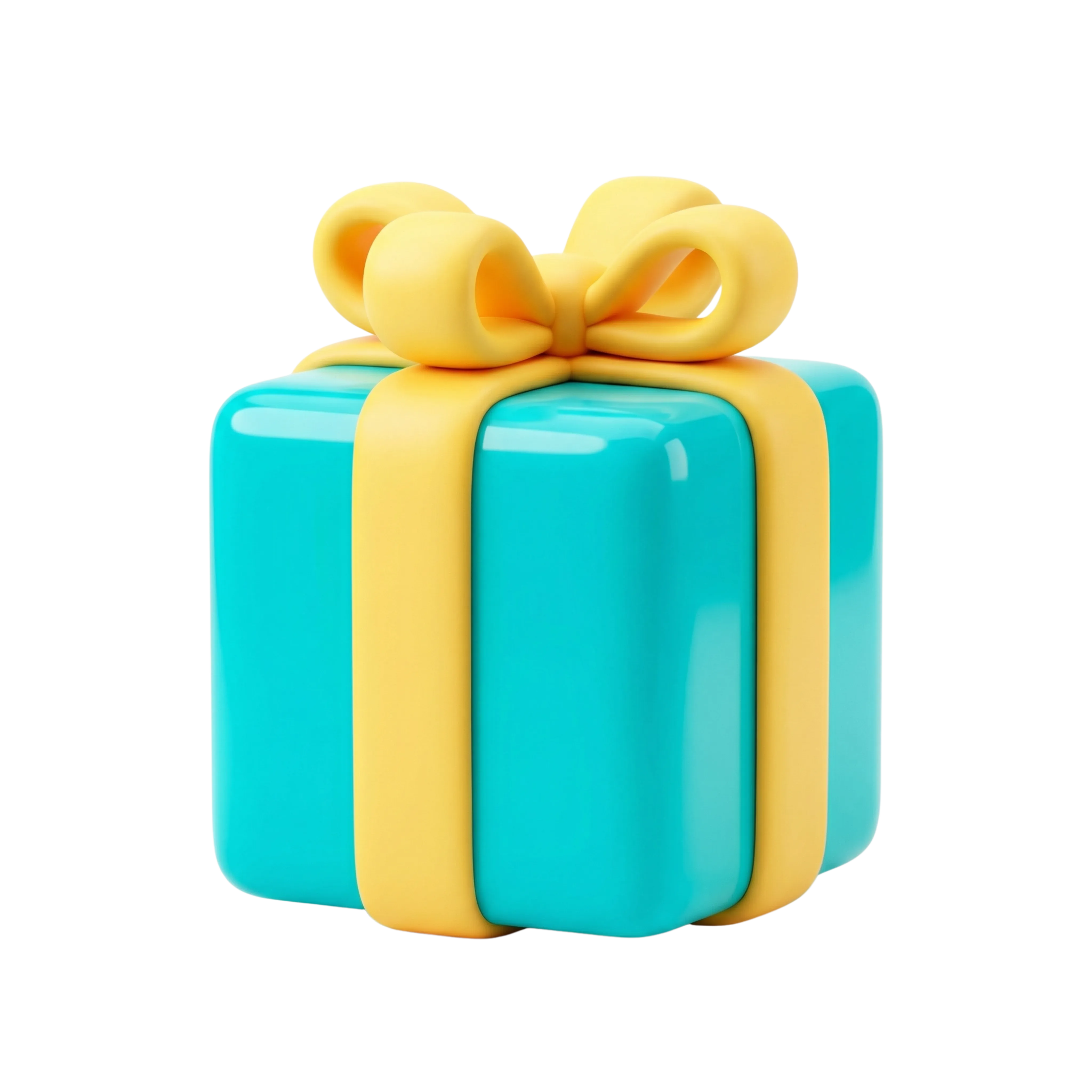 A high-quality 3D rendered icon featuring a smooth, glossy turquoise gift box wrapped with a bright yellow ribbon and bow. Ideal for use in UI/UX designs, celebration-themed graphics, mobile apps, and marketing materials related to festivities or rewards.