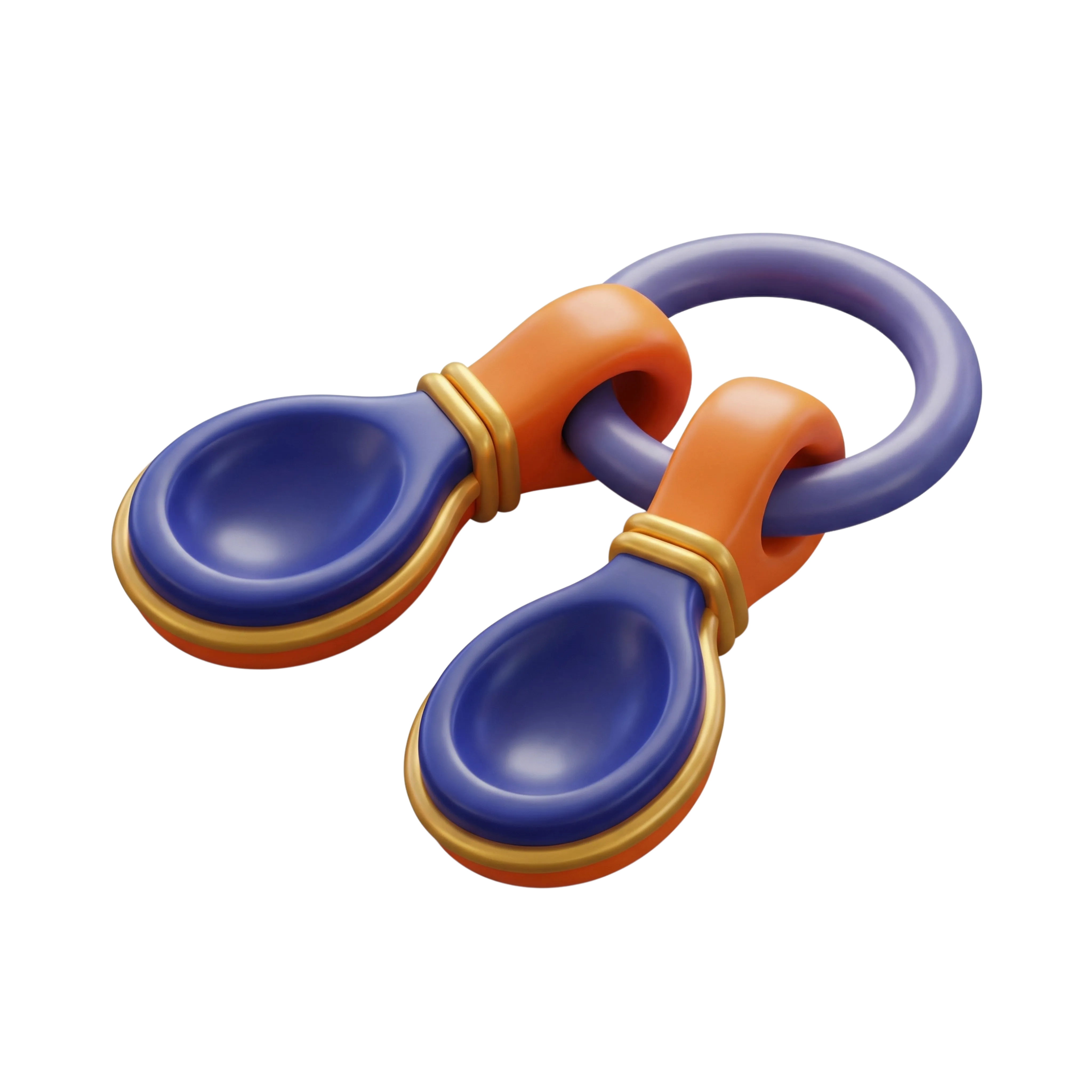 A highly detailed 3D render of iron castanets featuring a glossy plastic-like finish in vibrant blue, orange, and metallic gold accents. This musical percussion instrument is designed to resemble a pair of clappers connected by a circular loop, often used in rhythm-keeping performances or as cultural icons in dance practices. Ideal for user interfaces, educational apps, or illustrative animations.