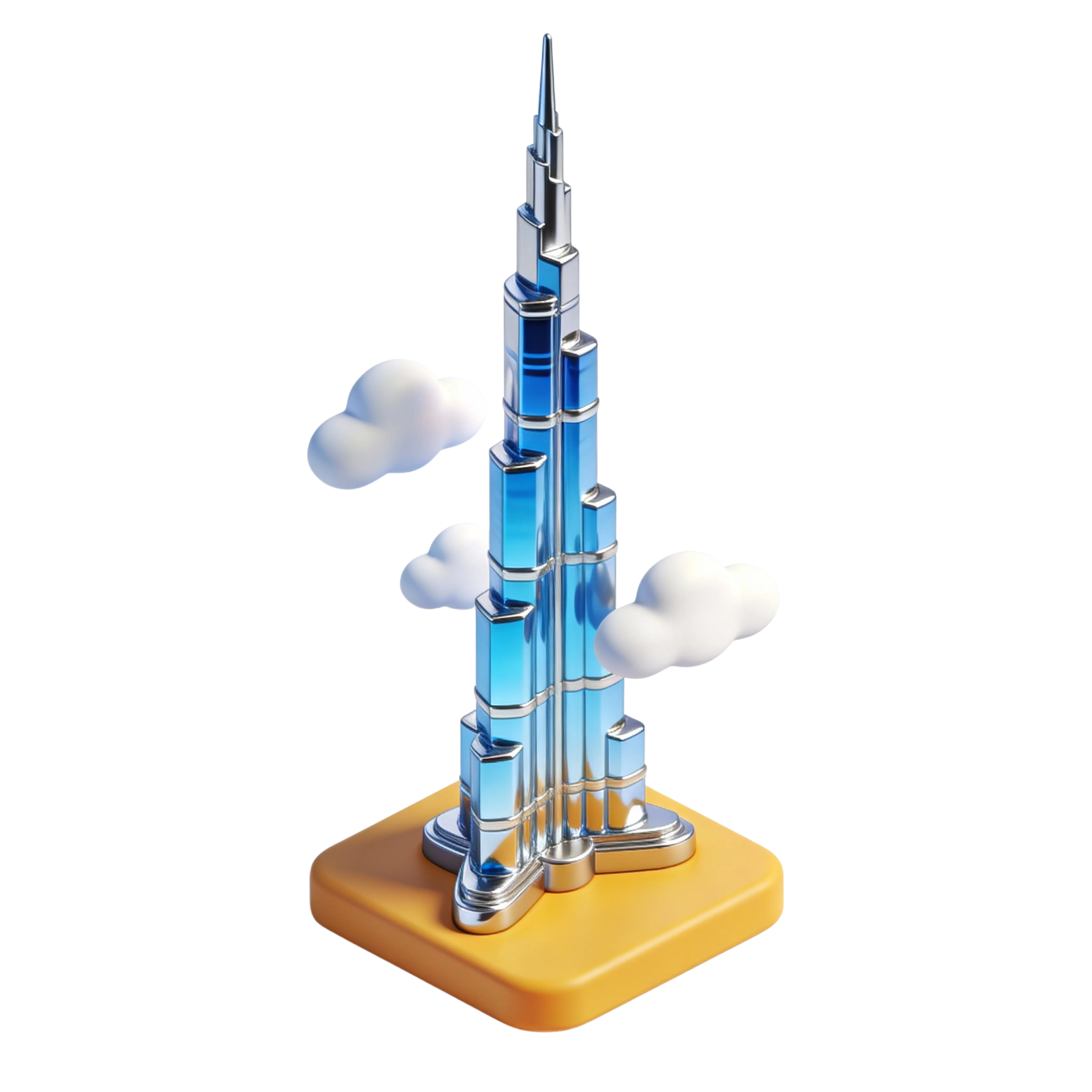 مجسم ثلاثي الأبعاد عالي الجودة لبرج خليفة الشهير يتميز بلمسة لامعة ومظهر زجاجي لونه أزرق، محاط بسحب ناعمة وقاعدة صفراء، مثالي للتطبيقات السياحية والأيقونات المعمارية والمحتوى التعليمي المتعلق بالإمارات.