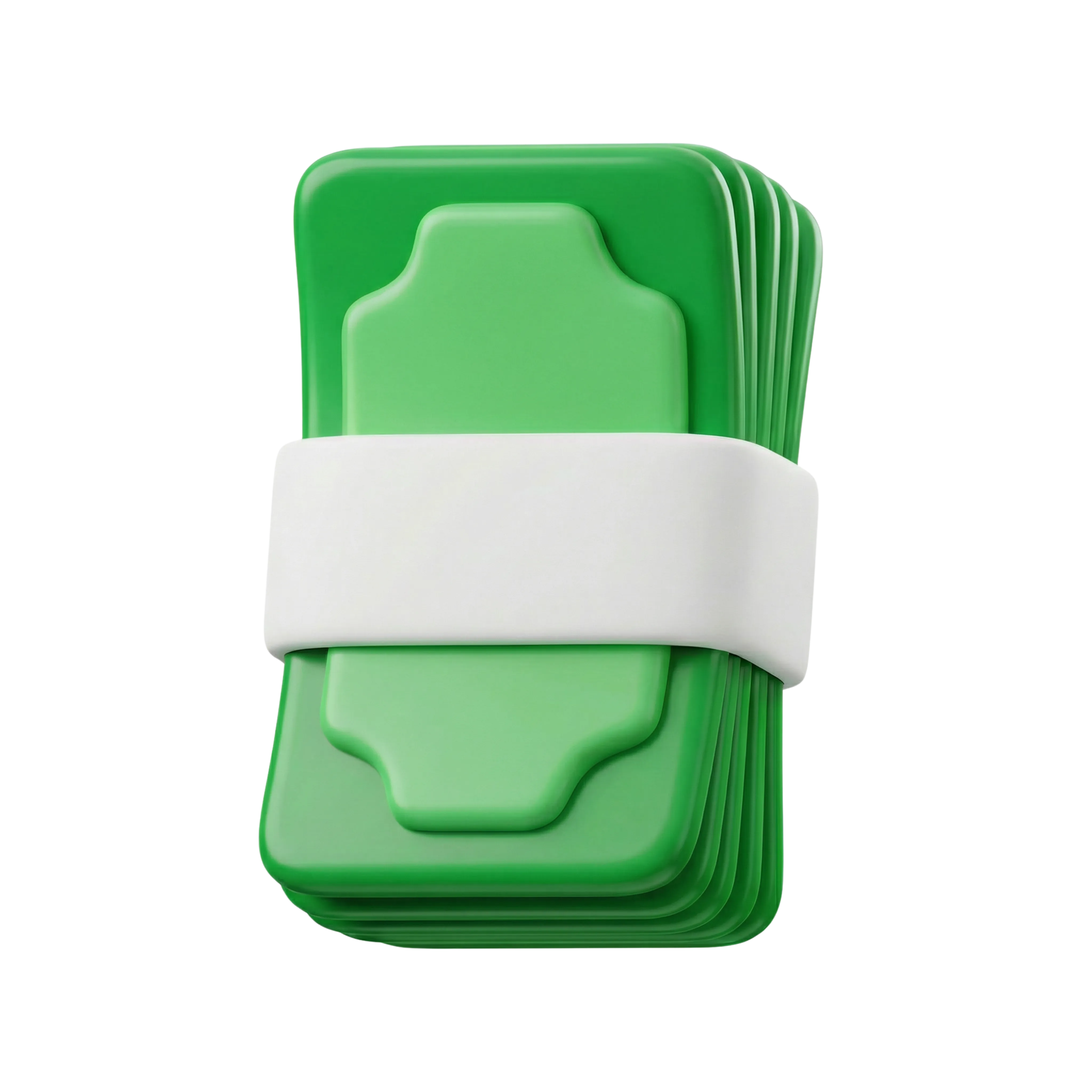 تصميم ثلاثي الأبعاد عالي الجودة لكومة نقود خضراء لامعة مربوطة بشريط أبيض، مثالية لتطبيقات الهواتف، واجهات المستخدم، الألعاب أو تصاميم التسويق التي تتطلب رمزًا واضحًا وحديثًا للمال أو المعاملات المالية.