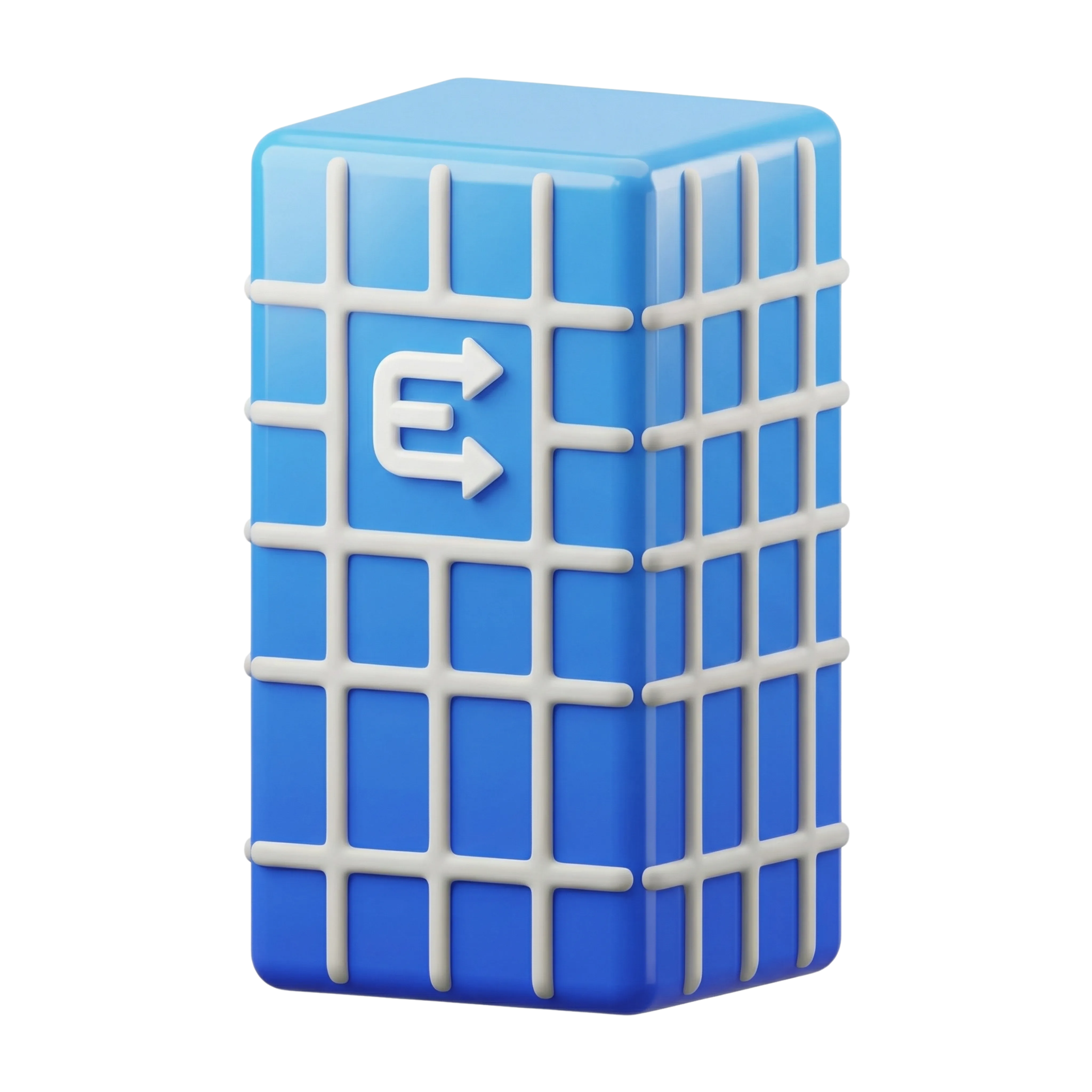 A stylized and glossy 3D illustration of an office building featuring a gradient blue finish, white structural grid lines, and a digital arrow icon. Ideal for use in mobile apps, UI design, and business or infrastructure-related visuals.