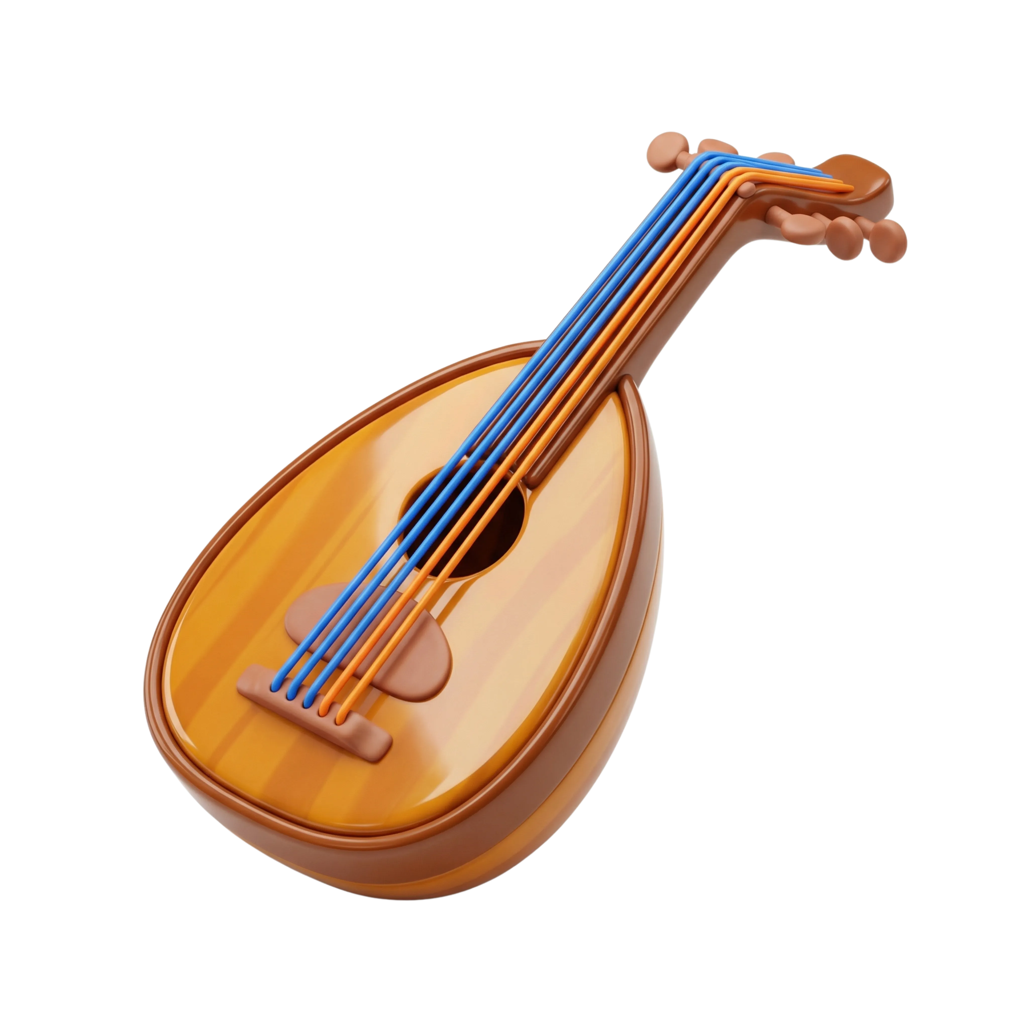 A high-quality 3D render of a traditional oud instrument featuring a glossy wooden texture and vibrant colored strings. This iconic Middle Eastern string instrument is ideal for use in music-related graphics, cultural presentations, and digital heritage exhibitions.