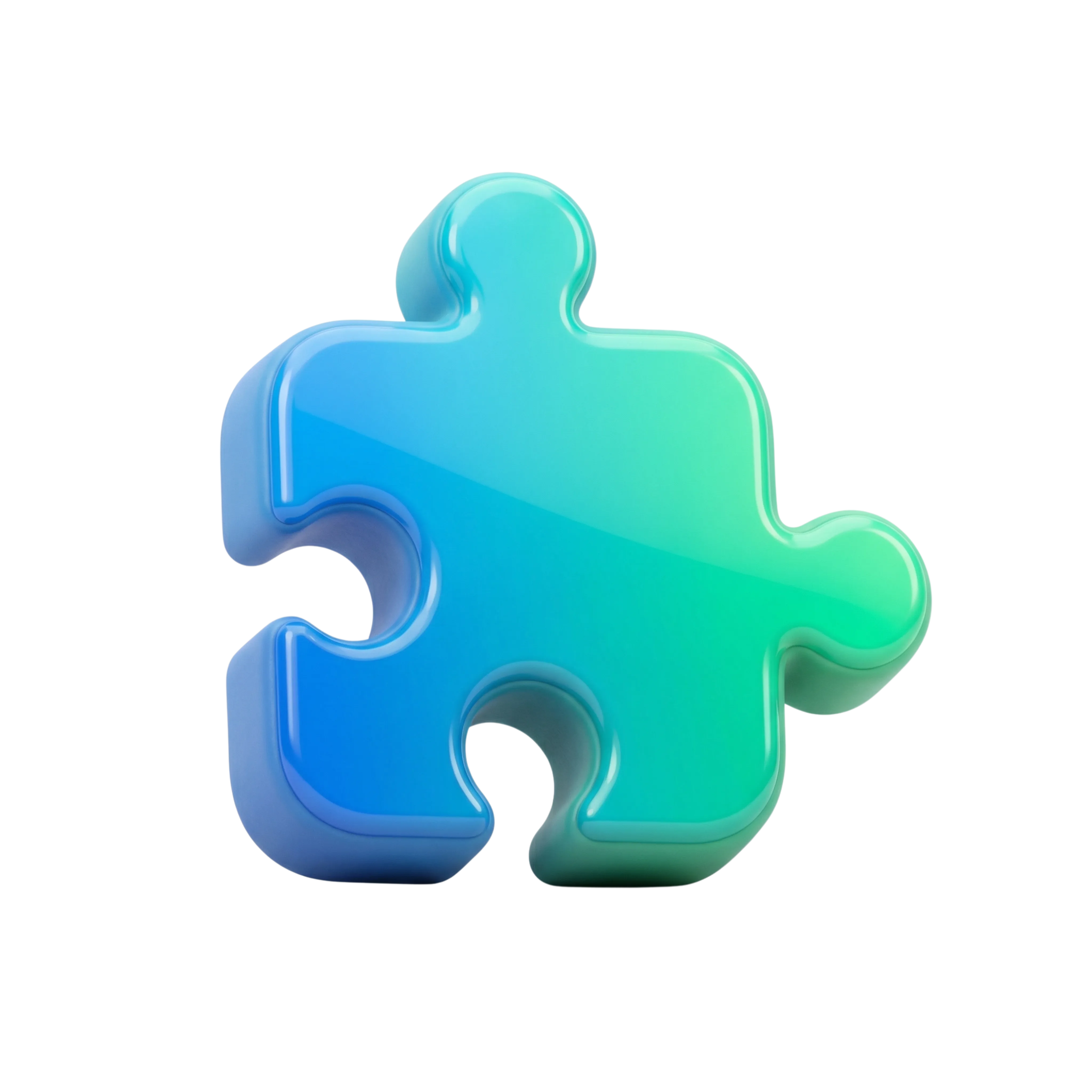 A high-quality 3D rendered icon resembling a puzzle piece with a glossy gradient finish in green and blue tones. Ideal for use in app interfaces, plugin representation, or system integration visuals where modular design and connectivity are emphasized.