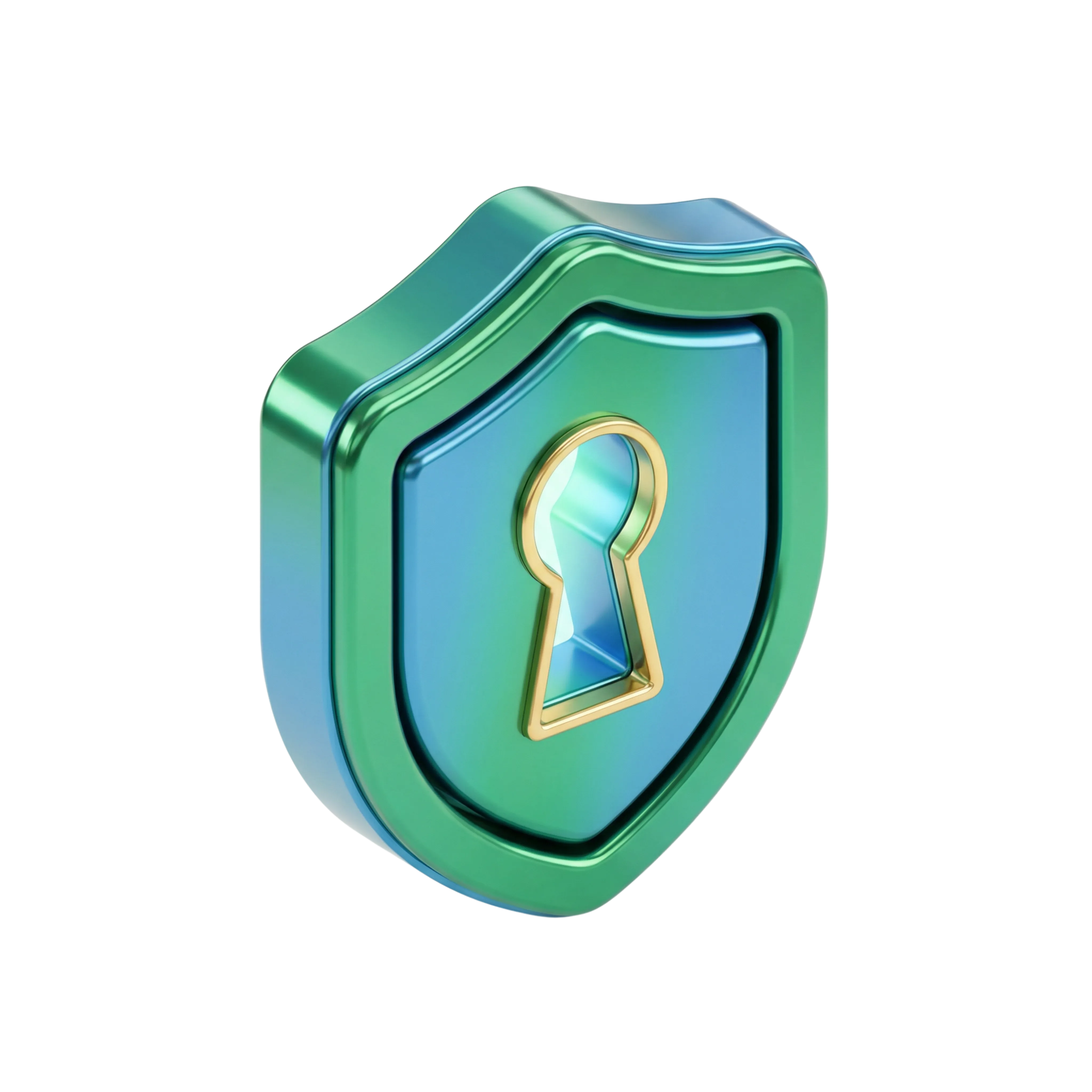 This is a high-quality 3D render of a secure shield icon, featuring a vibrant green and blue metallic finish with a centered golden keyhole. Designed with a glossy reflective surface, this icon represents security and protection—ideal for UI/UX design, web applications, and cybersecurity visuals.