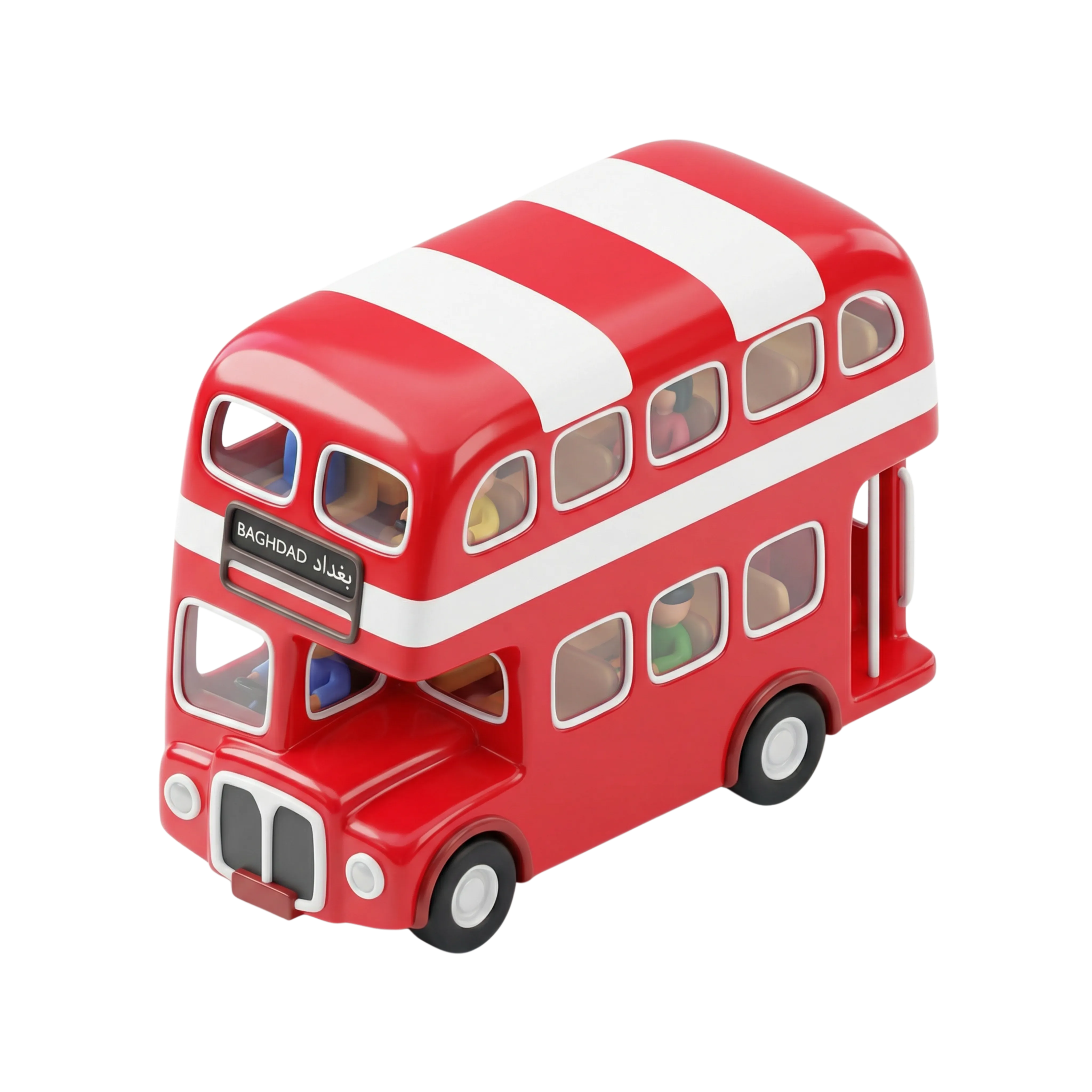 A stylized, high-quality 3D model of a red and white double-decker bus marked with 'Baghdad' on the front. The model features a glossy plastic-like finish with simplified geometry and visible seated characters inside. Ideal for educational illustrations, cultural graphics, or regional transportation themes.