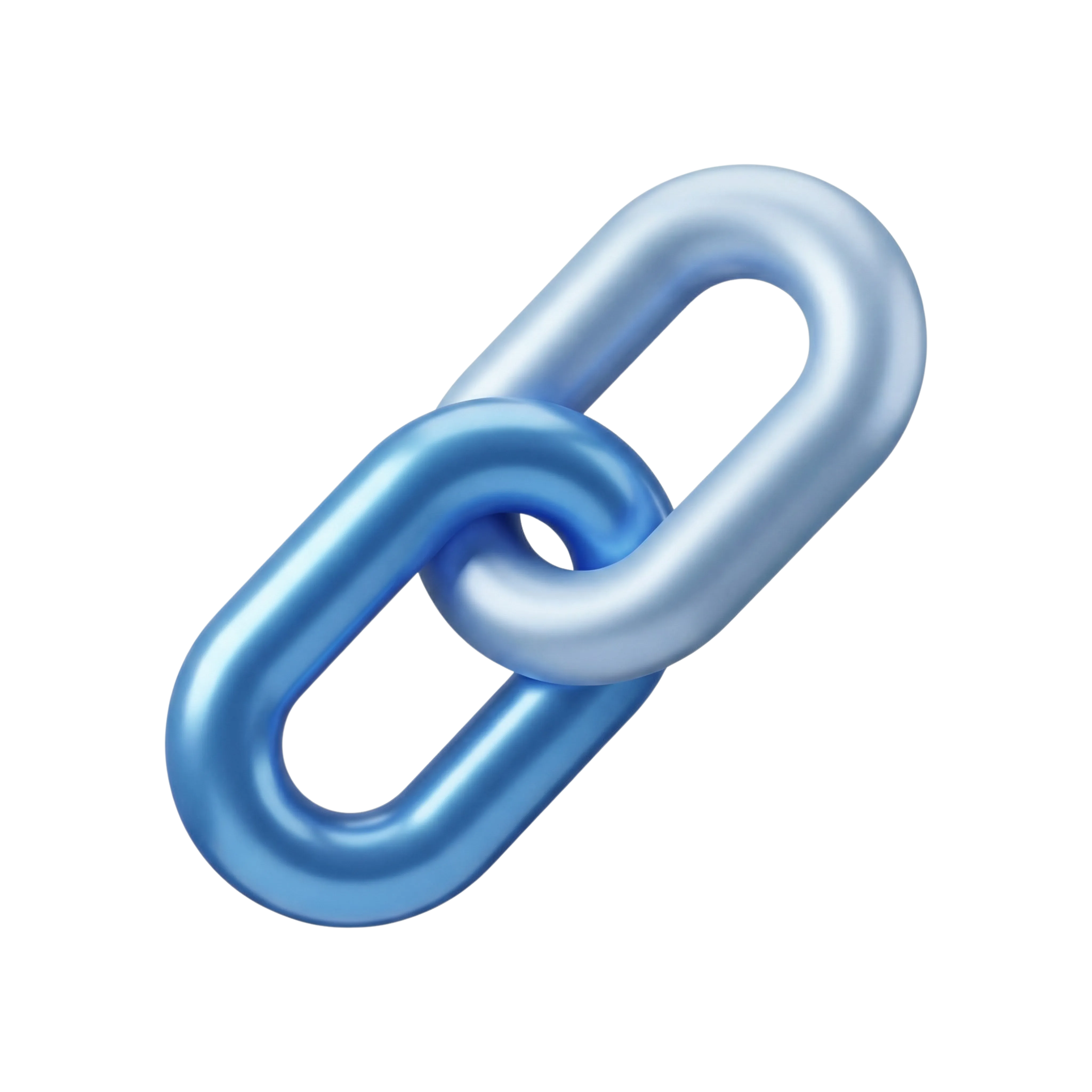 مجسم ثلاثي الأبعاد عالي الدقة لأيقونة سلسلة روابط بدرجتين من اللون الأزرق اللامع وبملمس معدني ناعم. مناسب لتصاميم الواجهات الرقمية، رموز الروابط، البلوك تشين، التصاميم المرتبطة بالاتصال أو بالأمان.
